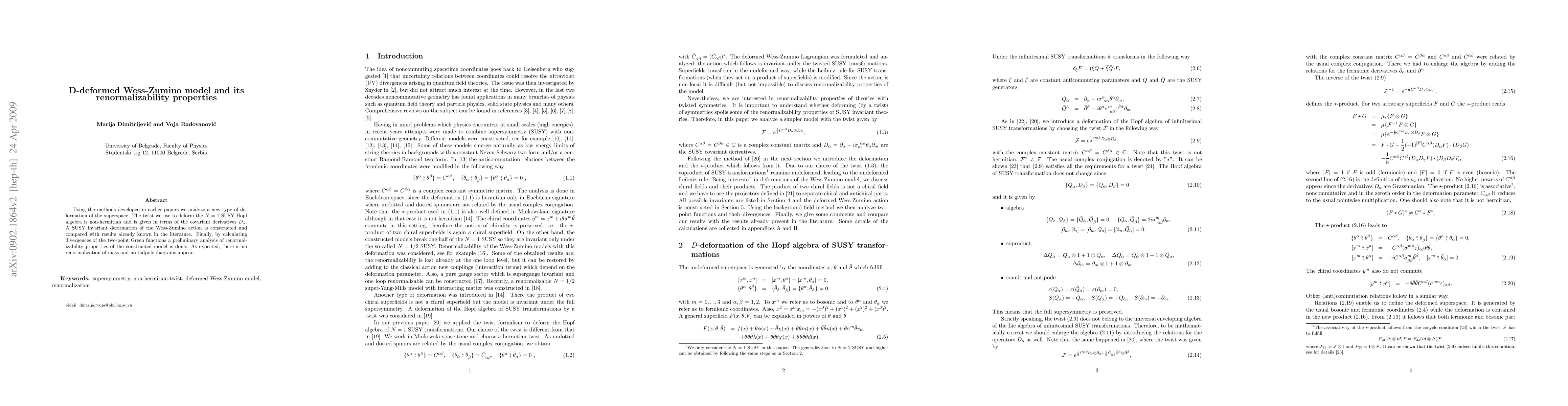 This paper explores a non-hermitian deformation of the N=1 SUSY Hopf algebra in superspace, constructing a SUSY invariant Wess-Zumino model. Preliminary analysis indicates no mass renormalization and absence of tadpole diagrams, suggesting promising renormalizability properties.