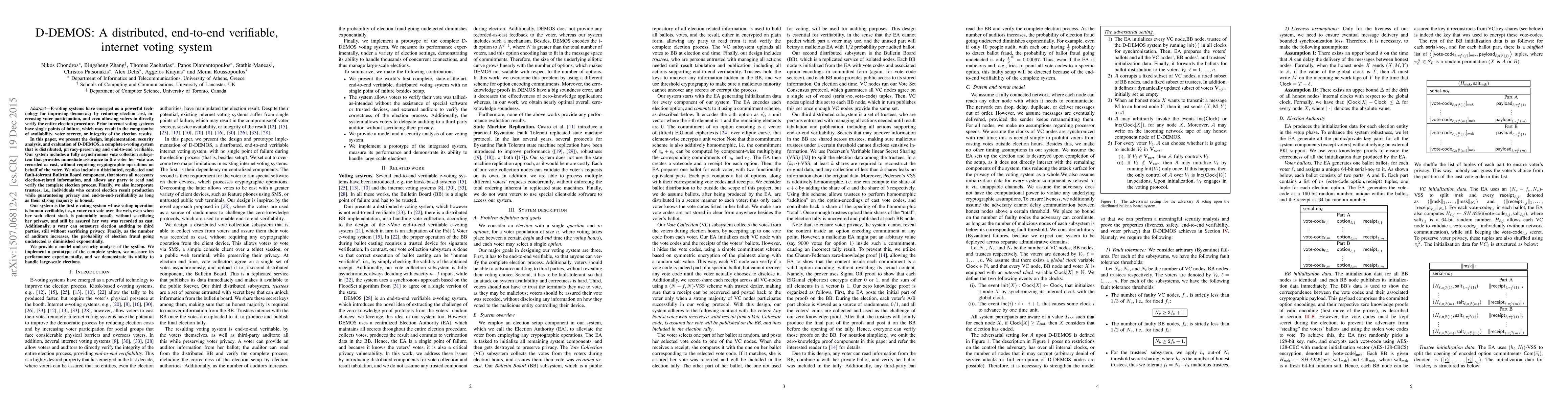 D-DEMOS is a distributed, end-to-end verifiable internet voting system designed to enhance election integrity, privacy, and voter participation by eliminating single points of failure. The system allows voters to verify their votes and audits without compromising privacy, even through potentially unsafe web clients.
