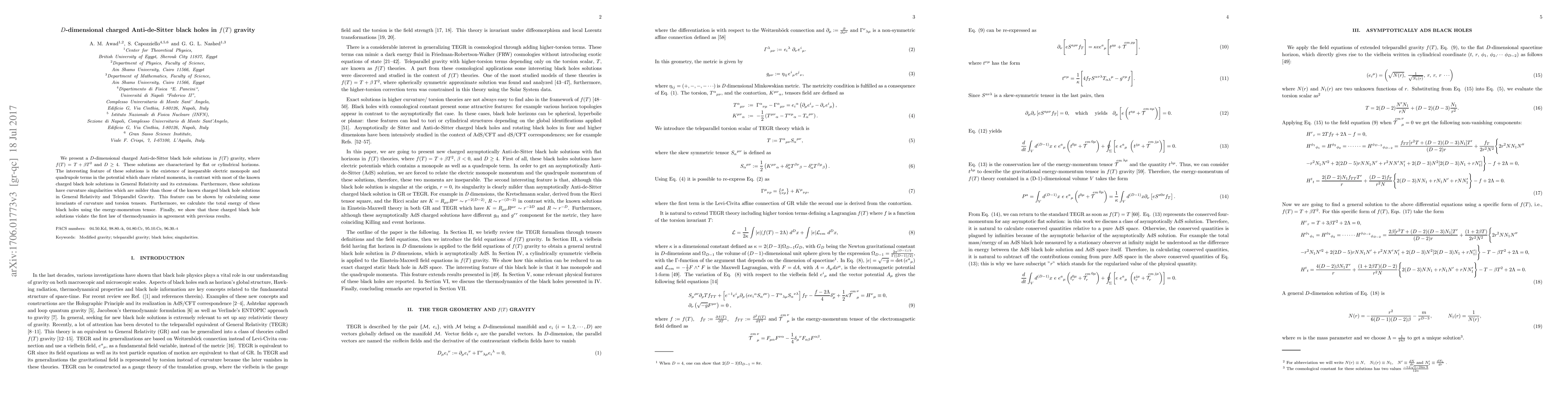 This paper presents $D$-dimensional charged Anti-de Sitter black hole solutions in $f(T)$ gravity, characterized by unique electric monopole and quadrupole terms. These solutions exhibit milder curvature singularities and violate the first law of thermodynamics, as shown through calculations of curvature invariants and energy-momentum tensor.