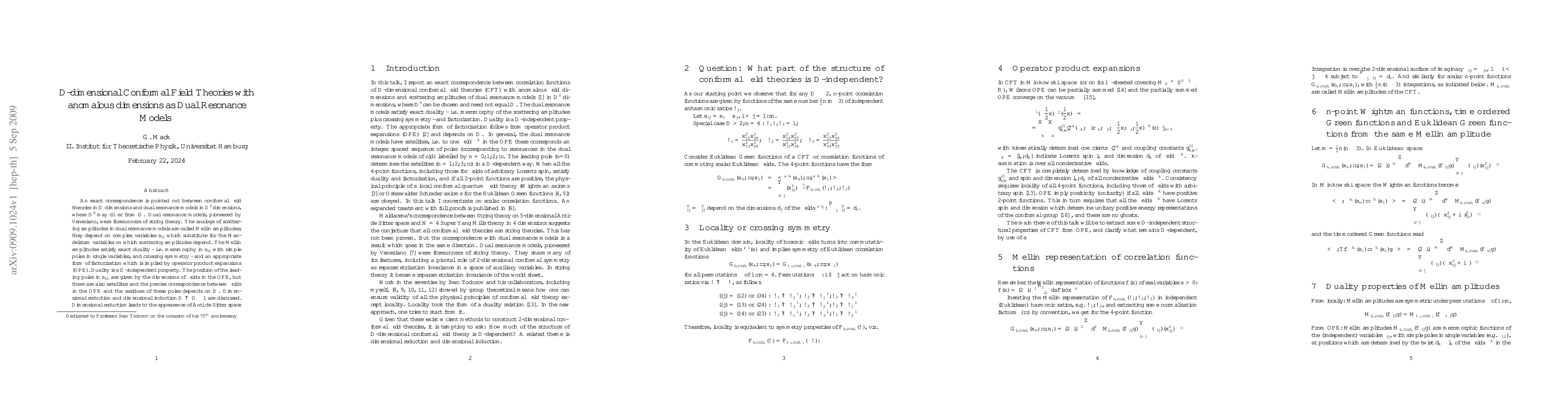 Researchers find an exact correspondence between conformal field theories in D dimensions and dual resonance models in D' dimensions, with duality properties preserved across different dimensions.