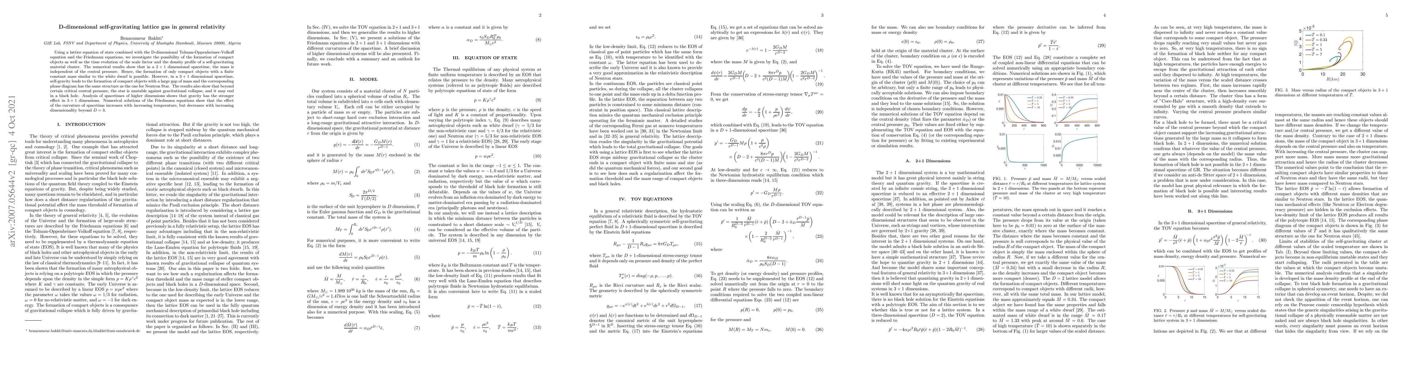 Using a lattice equation of state combined with the D-dimensional Tolman-Oppenheimer-Volkoff equation and the Friedmann equations, we investigate the possibility of the formation of compact objects as well as the time evolution of the scale factor and the density profile of a self-gravitating material cluster. The numerical results show that in a $2+1$ dimensional spacetime, the mass is independent of the central pressure. Hence, the formation of only compact objects with a finite constant mass similar to the white dwarf is possible. However, in a $3+1$ dimensional spacetime, self-gravity leads to the formation of compact objects with a large gap of mass and the corresponding phase diagram has the same structure as the one for Neutron Star. The results also show that beyond certain critical central pressure, the star is unstable against gravitational collapse, and it may end in a black hole. Analysis of spacetimes of higher dimensions shows that gravity has the stronger effect in $3+1$ dimensions. Numerical solutions of the Friedmann equations show that the effect of the curvature of spacetime increases with increasing temperature, but decreases with increasing dimensionality beyond $D=3$.