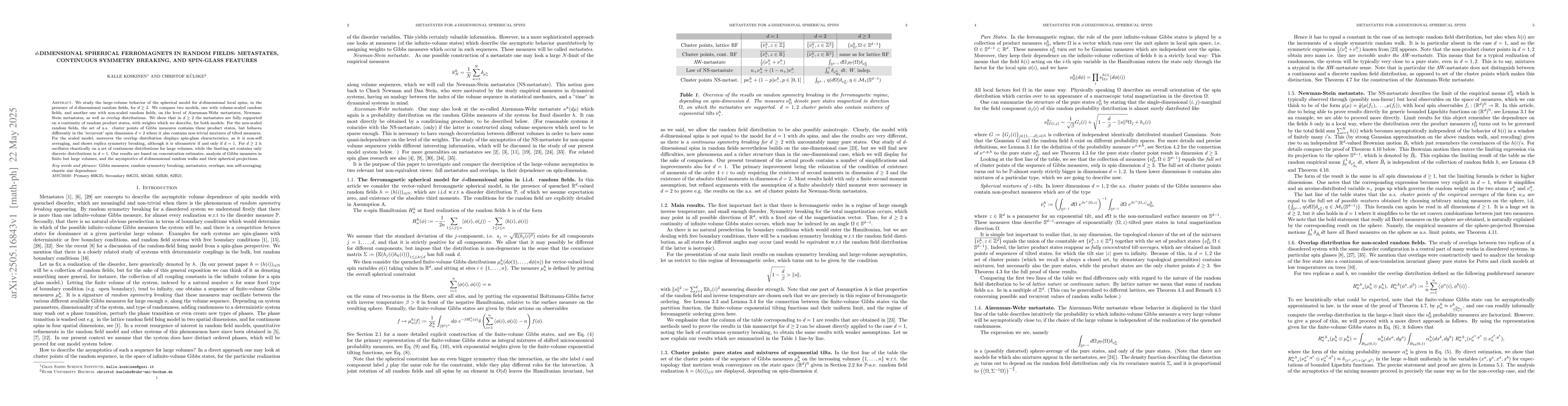 The paper presents detailed analysis of metastates, Newman-Stein metastates, and overlap distributions for both volume-scaled and non-scaled random field models, providing insights into continuous symmetry breaking and spin-glass features.