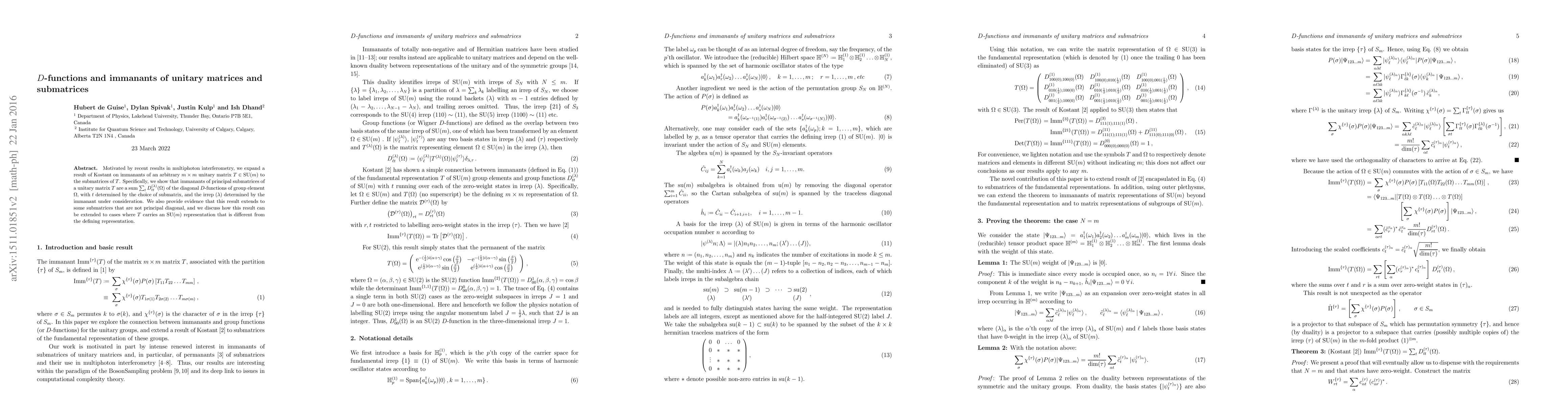 Motivated by recent results in multiphoton interferometry, we expand a result of Kostant on immanants of an arbitrary $m\times m$ unitary matrix $T\in$ su$(m)$ to the submatrices of $T$. Specifically, we show that immanants of principal submatrices of a unitary matrix $T$ are a sum $\sum_{t} D^{(\lambda)}_{tt}(\Omega)$ of the diagonal $D$-functions of group element $\Omega$, with $t$ determined {by} the choice of submatrix, and the irrep $(\lambda)$ determined by the immanant under consideration. We also provide evidence that this result extends to some submatrices that are not principal diagonal, and we discuss how this result can be extended to cases where $T$ carries an su$(m)$ representation that is different from the defining representation.