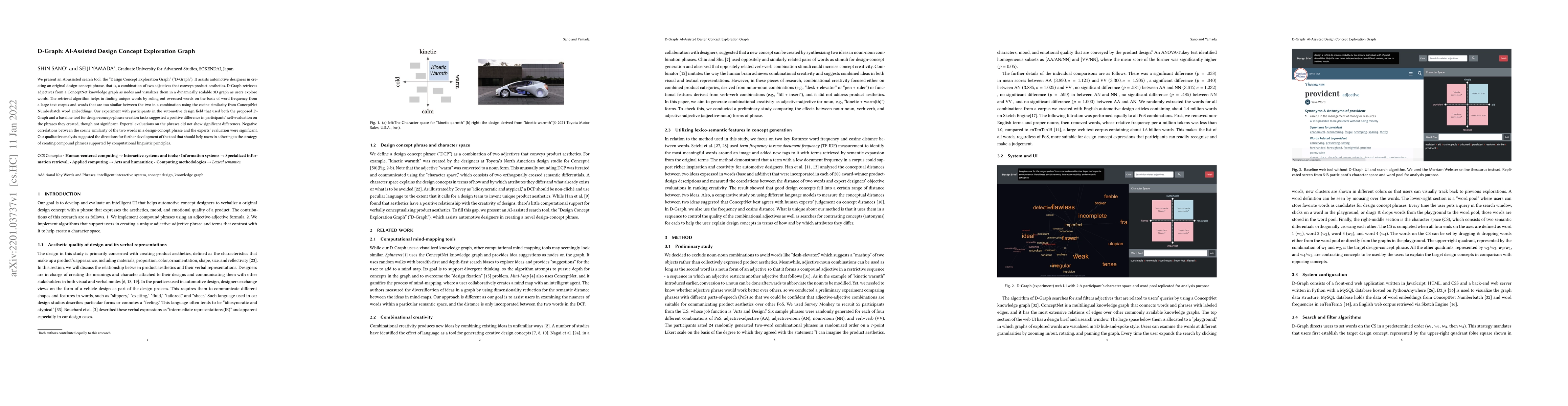 We present an AI-assisted search tool, the "Design Concept Exploration Graph" ("D-Graph"). It assists automotive designers in creating an original design-concept phrase, that is, a combination of two adjectives that conveys product aesthetics. D-Graph retrieves adjectives from a ConceptNet knowledge graph as nodes and visualizes them in a dynamically scalable 3D graph as users explore words. The retrieval algorithm helps in finding unique words by ruling out overused words on the basis of word frequency from a large text corpus and words that are too similar between the two in a combination using the cosine similarity from ConceptNet Numberbatch word embeddings. Our experiment with participants in the automotive design field that used both the proposed D-Graph and a baseline tool for design-concept-phrase creation tasks suggested a positive difference in participants' self-evaluation on the phrases they created, though not significant. Experts' evaluations on the phrases did not show significant differences. Negative correlations between the cosine similarity of the two words in a design-concept phrase and the experts' evaluation were significant. Our qualitative analysis suggested the directions for further development of the tool that should help users in adhering to the strategy of creating compound phrases supported by computational linguistic principles.