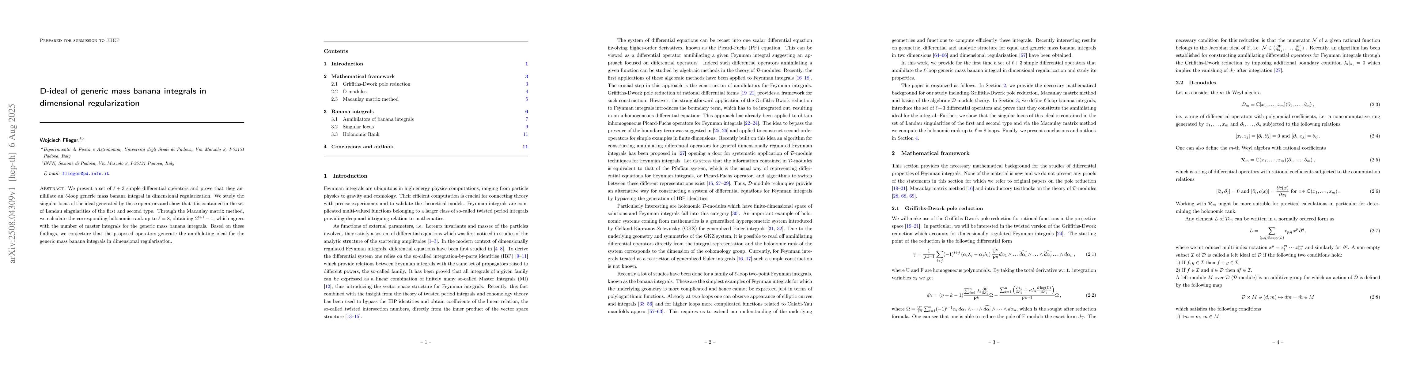 We present a set of $\ell + 3$ simple differential operators and prove that they annihilate an $\ell$-loop generic mass banana integral in dimensional regularization. We study the singular locus of the ideal generated by these operators and show that it is contained in the set of Landau singularities of the first and second type. Through the Macaulay matrix method, we calculate the corresponding holonomic rank up to $\ell = 8$, obtaining $2^{\ell +1}-1$, which agrees with the number of master integrals for the generic mass banana integrals. Based on these findings, we conjecture that the proposed operators generate the annihilating ideal for the generic mass banana integrals in dimensional regularization.