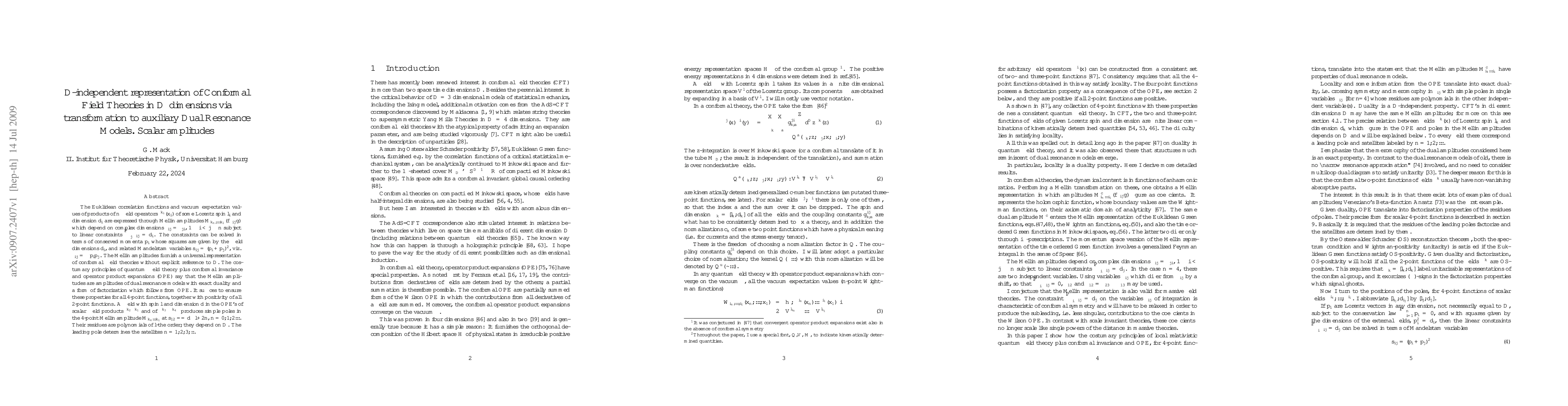 The Euklidean correlation functions and vacuum expectation values of products of field operators of some Lorentz spin and dimension are expressed through Mellin amplitudes which depend on complex dimensions subject to linear constraints. The constraints can be solved in terms of conserved momenta whose squares are given by the field dimensions, and related Mandelstam variables s. The Mellin amplitudes furnish a universal representation of conformal field theories without explicit reference to D. The costumary principles of quantum field theory plus conformal invariance and operator product expansions (OPE) say that the Mellin amplitudes are amplitudes of dual resonance models with exact duality and a form of factorization which follows from OPE. Fields in the OPE with spin l and dimension d produce simple poles in the scalar 4-point Mellin amplitude at s=d-l+2n, n=0,1,2,3... with polynomial residues. The leading pole determines the satellites n=1,2,3...