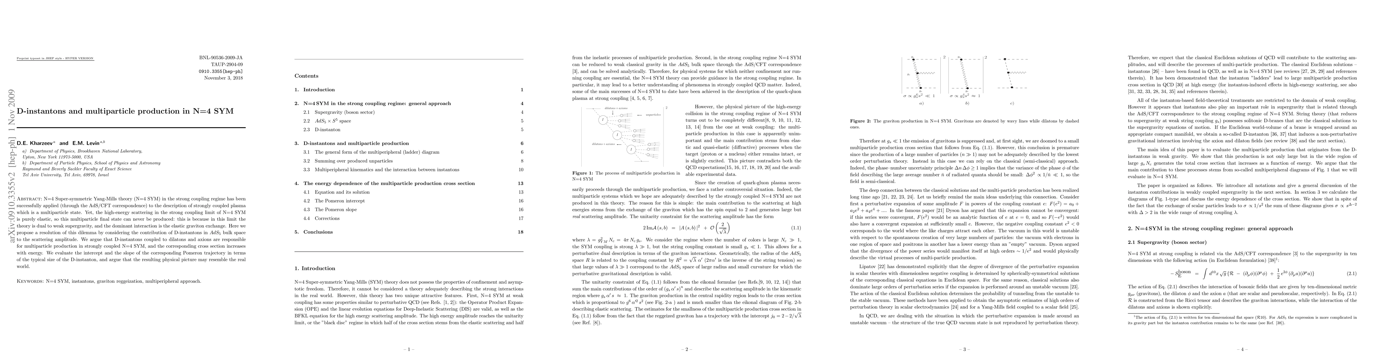 N=4 Super-symmetric Yang-Mills theory (N=4 SYM) in the strong coupling regime has been successfully applied (through the AdS/CFT correspondence) to the description of strongly coupled plasma which is a multiparticle state. Yet, the high-energy scattering in the strong coupling limit of N=4 SYM is purely elastic, so this multiparticle final state can never be produced: this is because in this limit the theory is dual to weak supergravity, and the dominant interaction is the elastic graviton exchange. Here we propose a resolution of this dilemma by considering the contribution of D-instantons in $AdS_5$ bulk space to the scattering amplitude. We argue that D-instantons coupled to dilatons and axions are responsible for multiparticle production in strongly coupled N=4 SYM, and the corresponding cross section increases with energy. We evaluate the intercept and the slope of the corresponding Pomeron trajectory in terms of the typical size of the D-instanton, and argue that the resulting physical picture may resemble the real world.