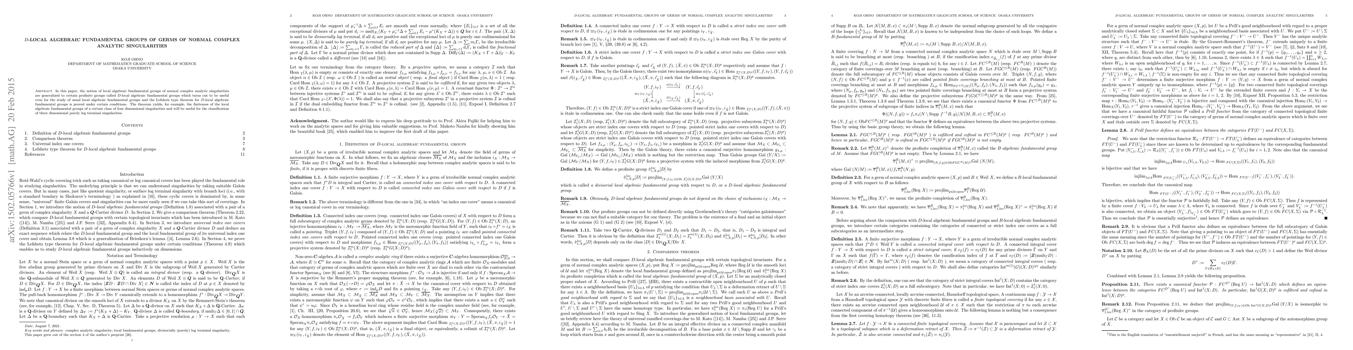 This paper introduces $D$-local algebraic fundamental groups for normal complex analytic singularities, extending the concept to profinite groups, and proves a Lefschetz-type theorem under specific conditions. This theorem demonstrates the finiteness of certain four-dimensional singularities and aids in classifying three-dimensional purely log terminal singularities.