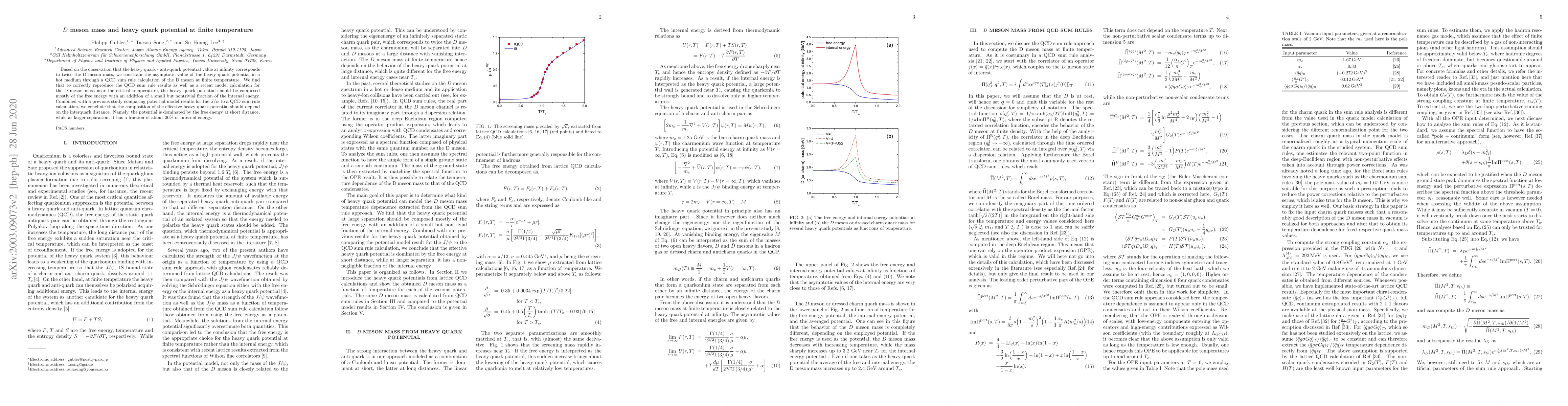 This paper investigates the heavy quark potential at finite temperature using QCD sum rules and finds that the potential's composition varies with inter-quark distance, dominated by free energy at short distances and including a 20% internal energy fraction at larger separations. The study also confirms the potential's asymptotic value through D meson mass calculations near the critical temperature.