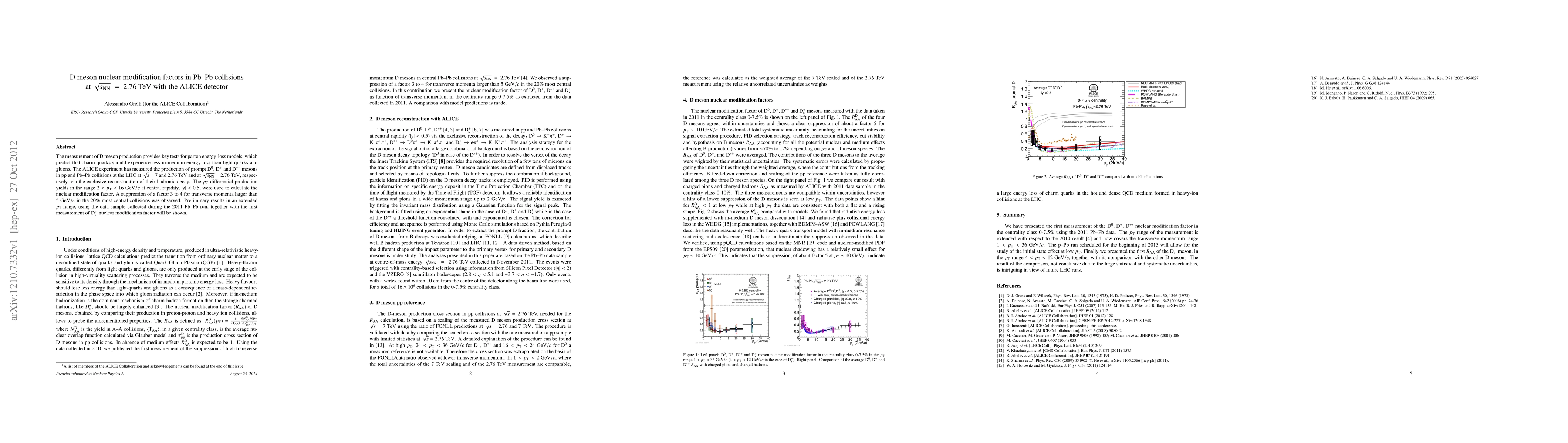 The ALICE experiment measured D meson production in Pb-Pb collisions at 2.76 TeV, revealing a suppression factor of 3 to 4 for high transverse momentum D mesons, suggesting reduced energy loss for charm quarks compared to light quarks. Preliminary results also include the first measurement of D^(+)_s nuclear modification factor.