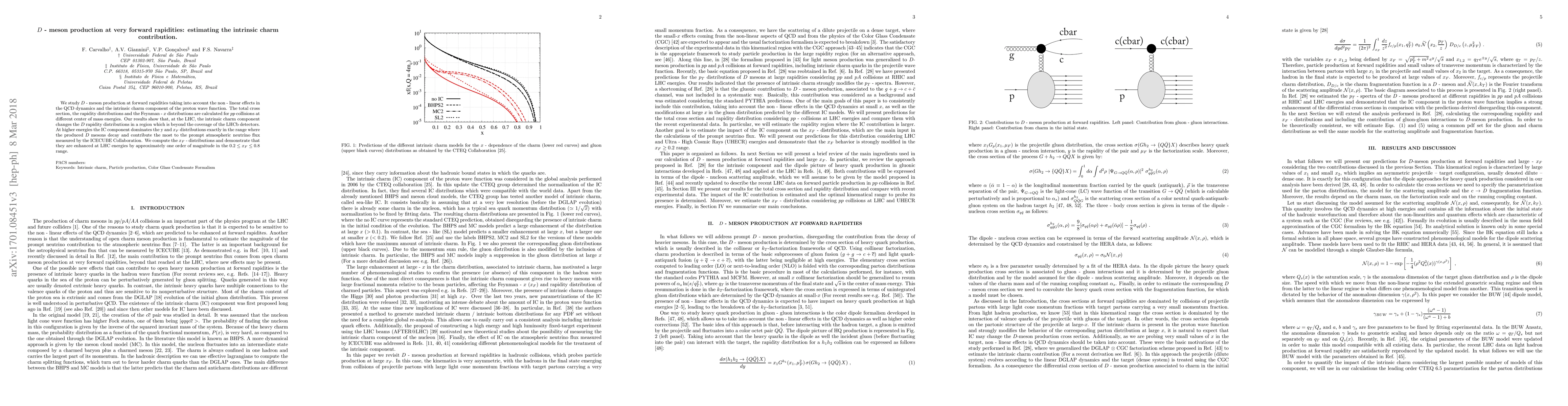 We study $D$ - meson production at forward rapidities taking into account the non - linear effects in the QCD dynamics and the intrinsic charm component of the proton wave function. The total cross section, the rapidity distributions and the Feynman - $x$ distributions are calculated for $p p$ collisions at different center of mass energies. Our results show that, at the LHC, the intrinsic charm component changes the $D$ rapidity distributions in a region which is beyond the coverage of the LHCb detectors. At higher energies the IC component dominates the $y$ and $x_F$ distributions exactly in the range where the produced $D$ mesons decay and contribute the most to the prompt atmospheric neutrino flux measured by the ICECUBE Collaboration. We compute the $x_F$ - distributions and demonstrate that they are enhanced at LHC energies by approximately one order of magnitude in the $0.2 \le x_F \le 0.8$ range.