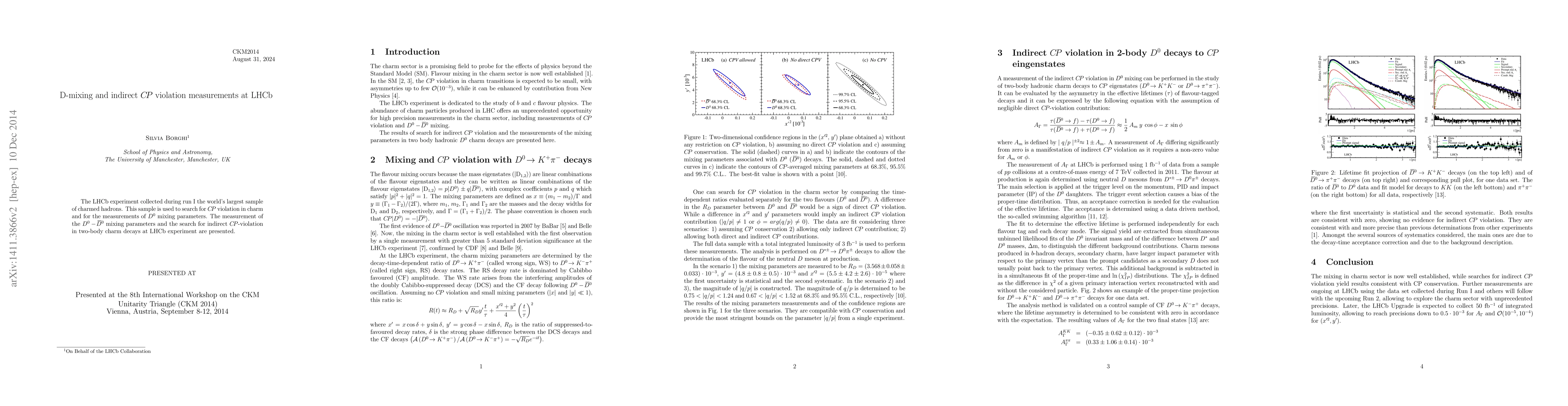 The LHCb experiment analyzed a large sample of charmed hadrons from run I to measure D0 to D0-bar mixing parameters and search for indirect CP-violation in two-body charm decays. These results enhance our understanding of CP violation in charm physics.