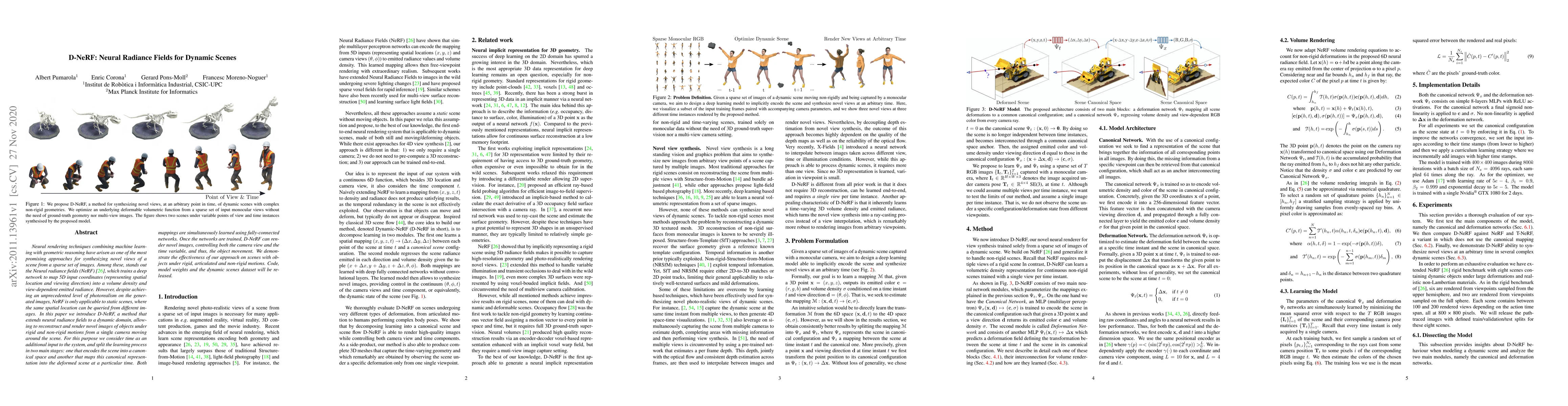 Neural rendering techniques combining machine learning with geometric reasoning have arisen as one of the most promising approaches for synthesizing novel views of a scene from a sparse set of images. Among these, stands out the Neural radiance fields (NeRF), which trains a deep network to map 5D input coordinates (representing spatial location and viewing direction) into a volume density and view-dependent emitted radiance. However, despite achieving an unprecedented level of photorealism on the generated images, NeRF is only applicable to static scenes, where the same spatial location can be queried from different images. In this paper we introduce D-NeRF, a method that extends neural radiance fields to a dynamic domain, allowing to reconstruct and render novel images of objects under rigid and non-rigid motions from a \emph{single} camera moving around the scene. For this purpose we consider time as an additional input to the system, and split the learning process in two main stages: one that encodes the scene into a canonical space and another that maps this canonical representation into the deformed scene at a particular time. Both mappings are simultaneously learned using fully-connected networks. Once the networks are trained, D-NeRF can render novel images, controlling both the camera view and the time variable, and thus, the object movement. We demonstrate the effectiveness of our approach on scenes with objects under rigid, articulated and non-rigid motions. Code, model weights and the dynamic scenes dataset will be released.