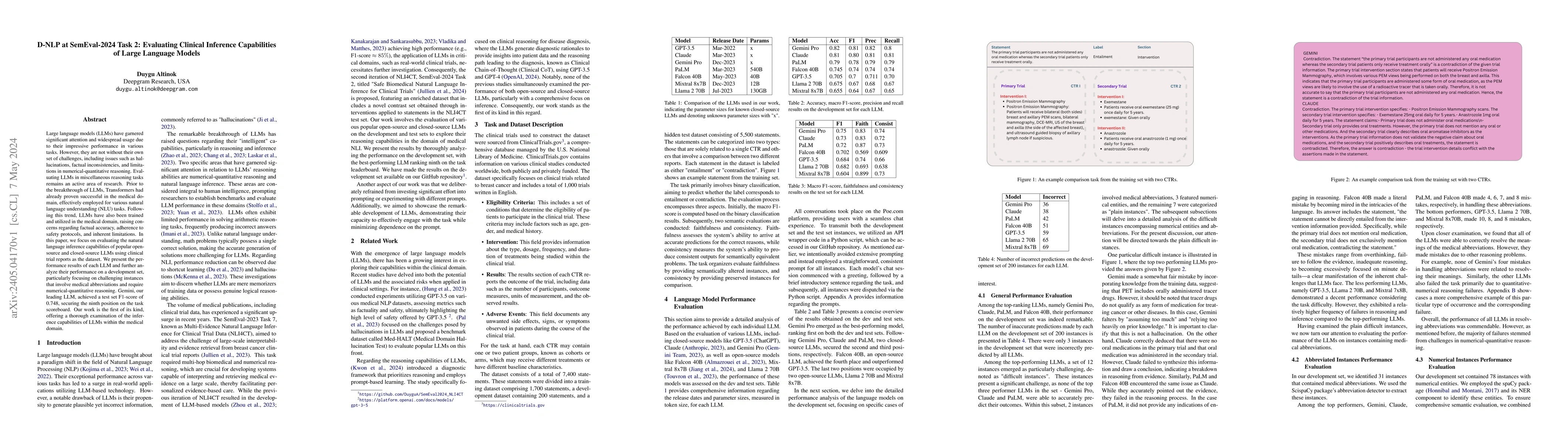 Large language models (LLMs) have garnered significant attention and widespread usage due to their impressive performance in various tasks. However, they are not without their own set of challenges, including issues such as hallucinations, factual inconsistencies, and limitations in numerical-quantitative reasoning. Evaluating LLMs in miscellaneous reasoning tasks remains an active area of research. Prior to the breakthrough of LLMs, Transformers had already proven successful in the medical domain, effectively employed for various natural language understanding (NLU) tasks. Following this trend, LLMs have also been trained and utilized in the medical domain, raising concerns regarding factual accuracy, adherence to safety protocols, and inherent limitations. In this paper, we focus on evaluating the natural language inference capabilities of popular open-source and closed-source LLMs using clinical trial reports as the dataset. We present the performance results of each LLM and further analyze their performance on a development set, particularly focusing on challenging instances that involve medical abbreviations and require numerical-quantitative reasoning. Gemini, our leading LLM, achieved a test set F1-score of 0.748, securing the ninth position on the task scoreboard. Our work is the first of its kind, offering a thorough examination of the inference capabilities of LLMs within the medical domain.
