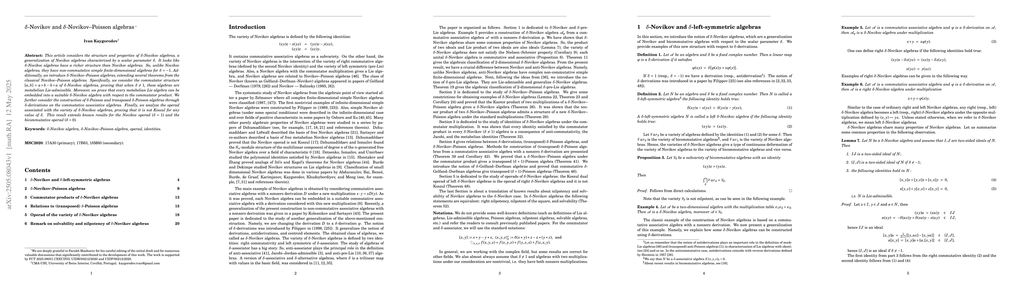 The introduction and detailed analysis of δ-Novikov and δ-Novikov--Poisson algebras, along with their structural properties and the associated operad's non-Koszul nature.