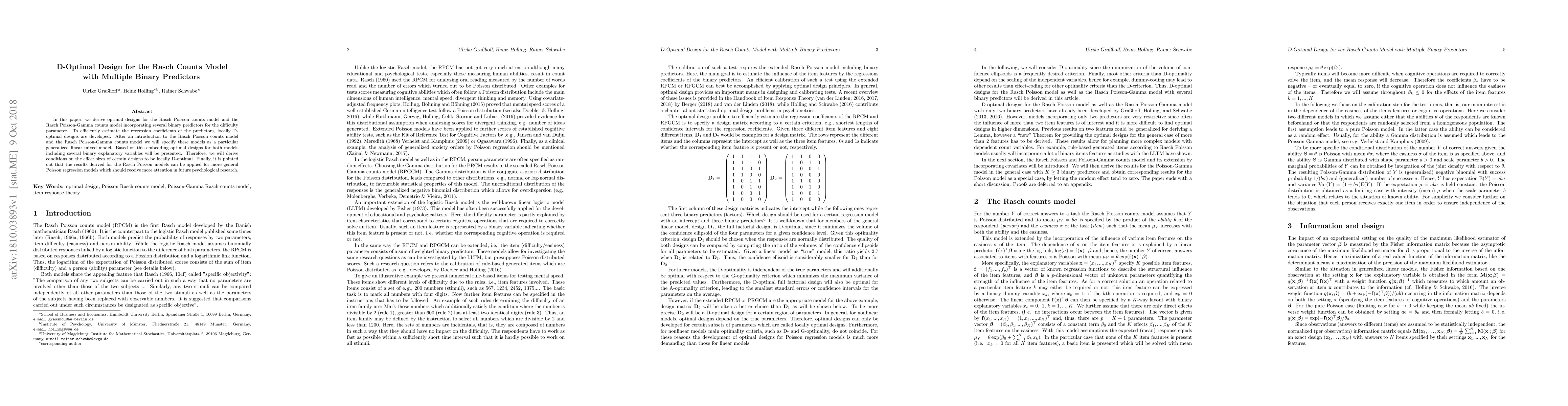 In this paper, we derive optimal designs for the Rasch Poisson counts model and the Rasch Poisson-Gamma counts model incorporating several binary predictors for the difficulty parameter. To efficiently estimate the regression coefficients of the predictors, locally D-optimal designs are developed. After an introduction to the Rasch Poisson counts model and the Rasch Poisson-Gamma counts model we will specify these models as a particular generalized linear mixed model. Based on this embedding optimal designs for both models including several binary explanatory variables will be presented. Therefore, we will derive conditions on the effect sizes of certain designs to be locally D-optimal. Finally, it is pointed out that the results derived for the Rasch Poisson models can be applied for more general Poisson regression models which should receive more attention in future psychological research.