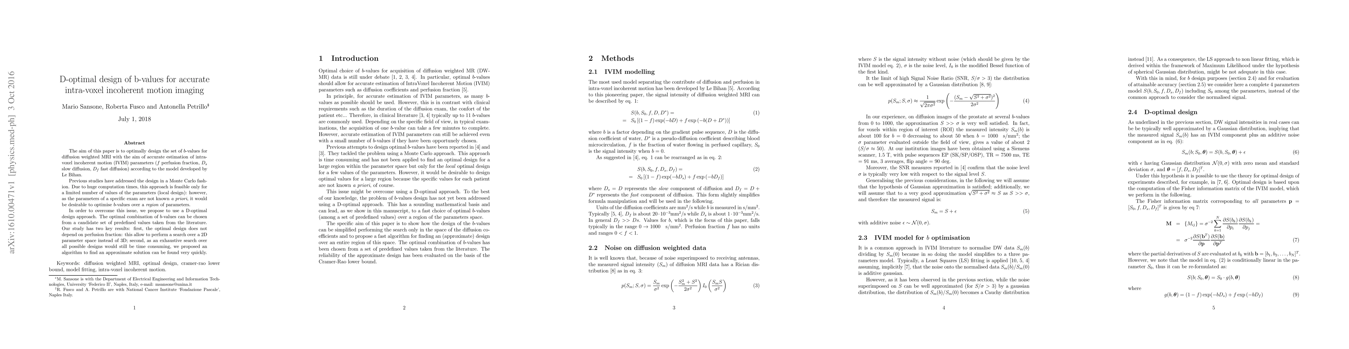 This paper proposes a D-optimal design approach to determine the optimal set of b-values for diffusion-weighted MRI to accurately estimate intra-voxel incoherent motion parameters. The optimal b-values are found to be independent of the perfusion fraction, allowing for a more efficient 2D search over parameter space.