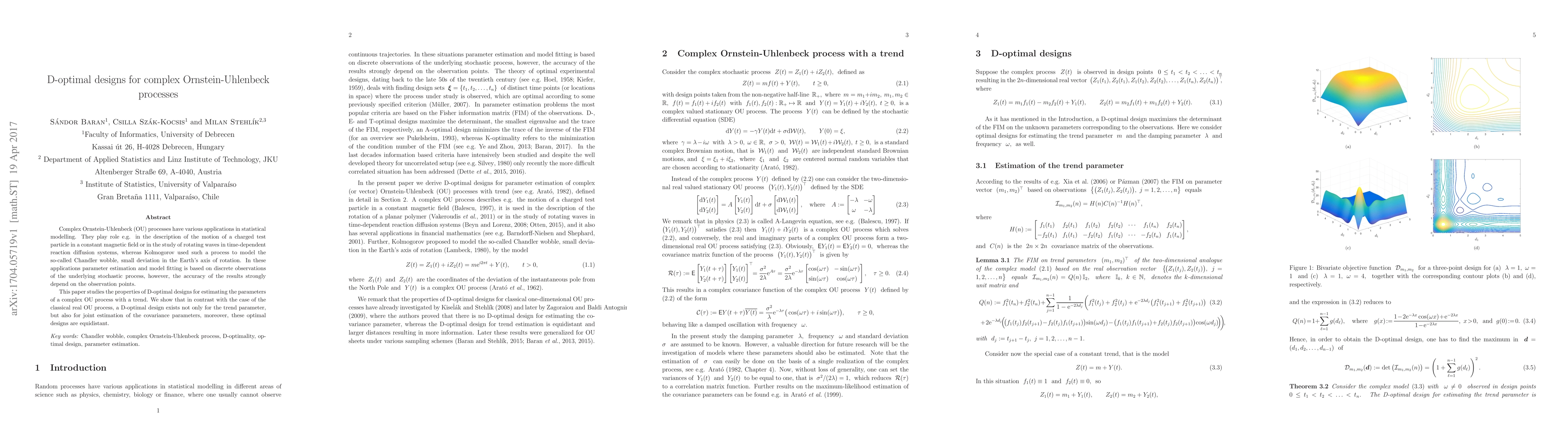 Complex Ornstein-Uhlenbeck (OU) processes have various applications in statistical modelling. They play role e.g. in the description of the motion of a charged test particle in a constant magnetic field or in the study of rotating waves in time-dependent reaction diffusion systems, whereas Kolmogorov used such a process to model the so-called Chandler wobble, small deviation in the Earth's axis of rotation. In these applications parameter estimation and model fitting is based on discrete observations of the underlying stochastic process, however, the accuracy of the results strongly depend on the observation points. This paper studies the properties of D-optimal designs for estimating the parameters of a complex OU process with a trend. We show that in contrast with the case of the classical real OU process, a D-optimal design exists not only for the trend parameter, but also for joint estimation of the covariance parameters, moreover, these optimal designs are equidistant.