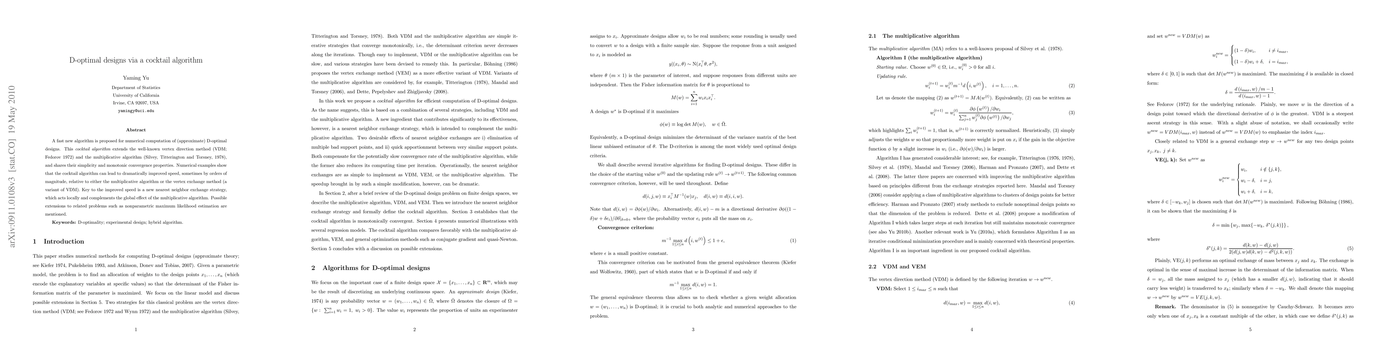 This paper introduces a novel "cocktail algorithm" for computing D-optimal designs, significantly improving speed over existing methods. It combines the simplicity of the vertex direction method and the multiplicative algorithm, achieving monotonic convergence and often outperforming them by orders of magnitude due to a new local nearest neighbor exchange strategy.