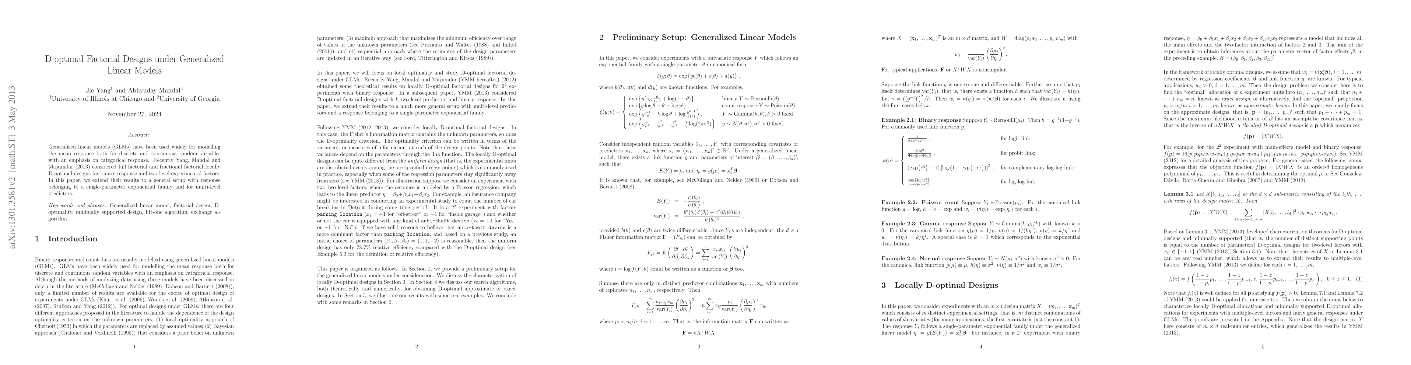 This paper extends previous work on D-optimal factorial designs for binary responses to generalized linear models (GLMs) with multi-level predictors and responses from a single-parameter exponential family. It aims to provide a broader framework for designing experiments under these generalized conditions.