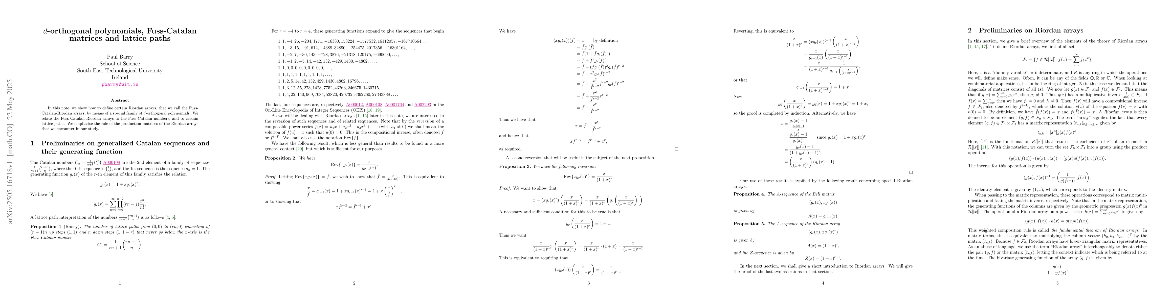 This paper introduces a new family of Riordan arrays defined using $d$-orthogonal polynomials, relating them to Fuss-Catalan numbers and lattice paths, with a focus on production matrices.