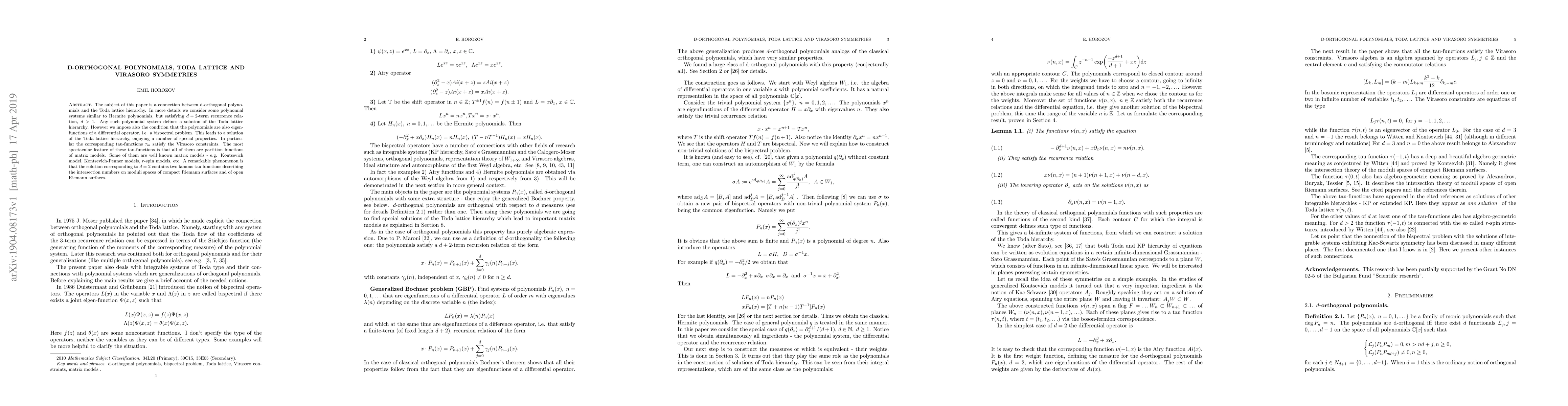 This paper explores the relationship between d-orthogonal polynomials and the Toda lattice hierarchy, revealing that such polynomials define solutions with special properties, including Virasoro symmetry. The tau-functions derived from these solutions are partition functions of notable matrix models, including the Kontsevich model and intersection numbers on moduli spaces.