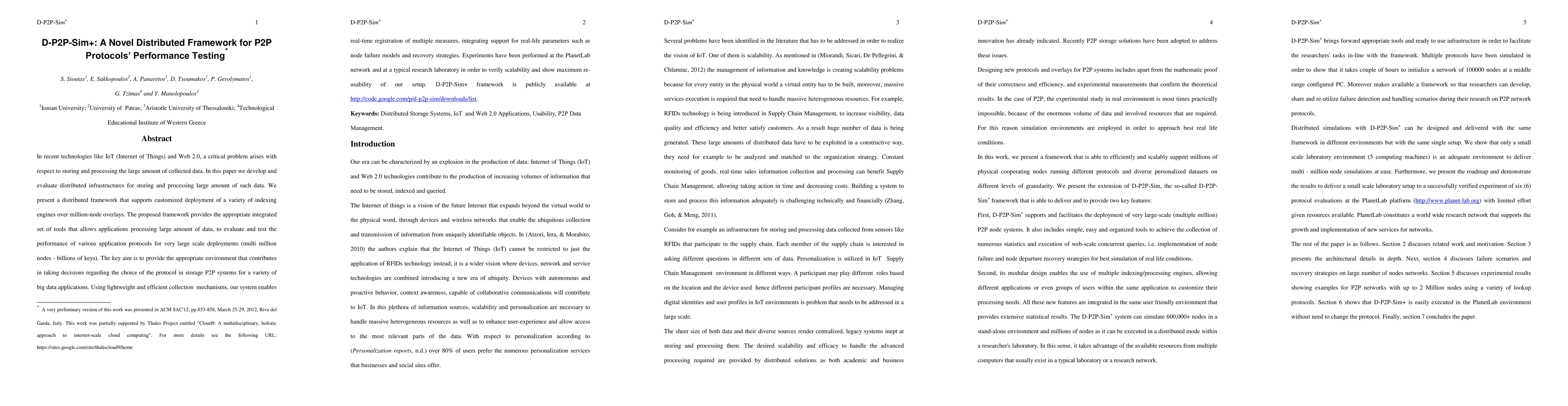 This paper introduces D-P2P-Sim+, a distributed framework for testing P2P protocols' performance in large-scale deployments with millions of nodes and billions of keys.