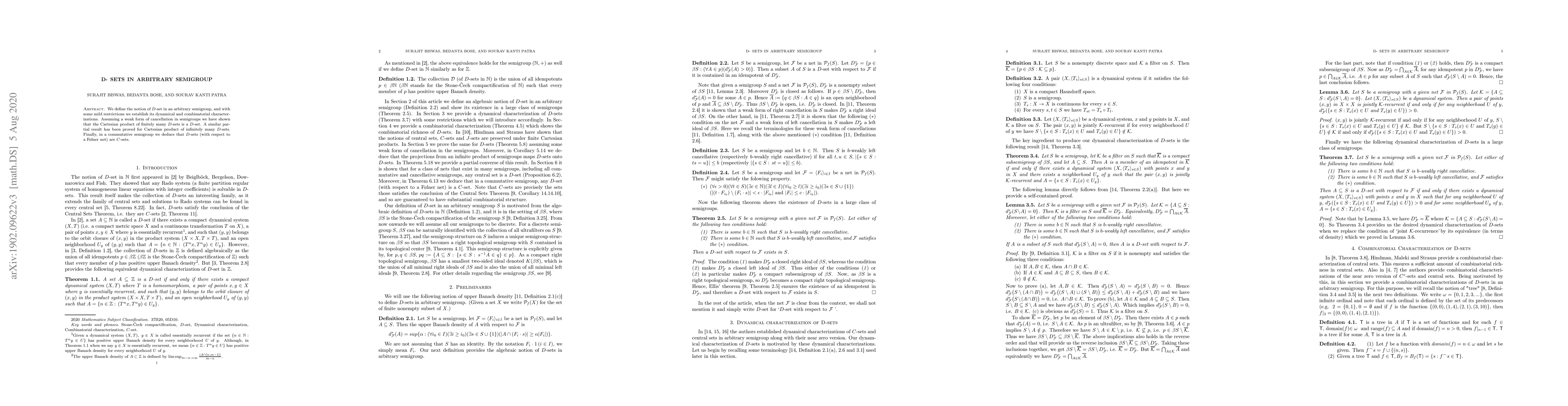 This paper introduces $D$-sets in arbitrary semigroups, establishing their dynamical and combinatorial properties under mild restrictions. It demonstrates that the Cartesian product of finitely many $D$-sets remains a $D$-set, and provides a partial result for infinitely many $D$-sets. Additionally, it shows that $D$-sets in commutative semigroups are $C$-sets with respect to a Følner net.