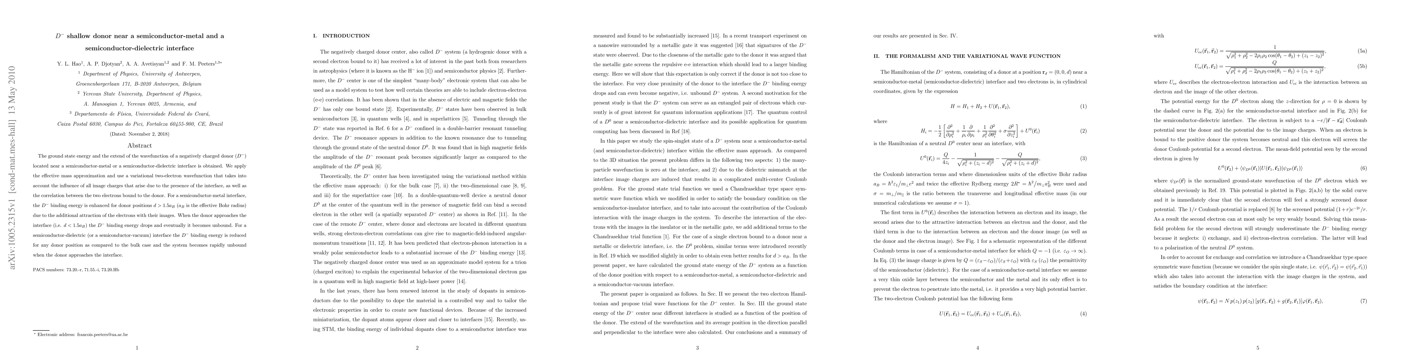 This paper investigates the ground state energy and wavefunction of a negatively charged donor near semiconductor-metal and semiconductor-dielectric interfaces. It finds that the donor's binding energy is enhanced when far from the interface but drops and becomes unbound as it approaches, with different behaviors depending on the type of interface.