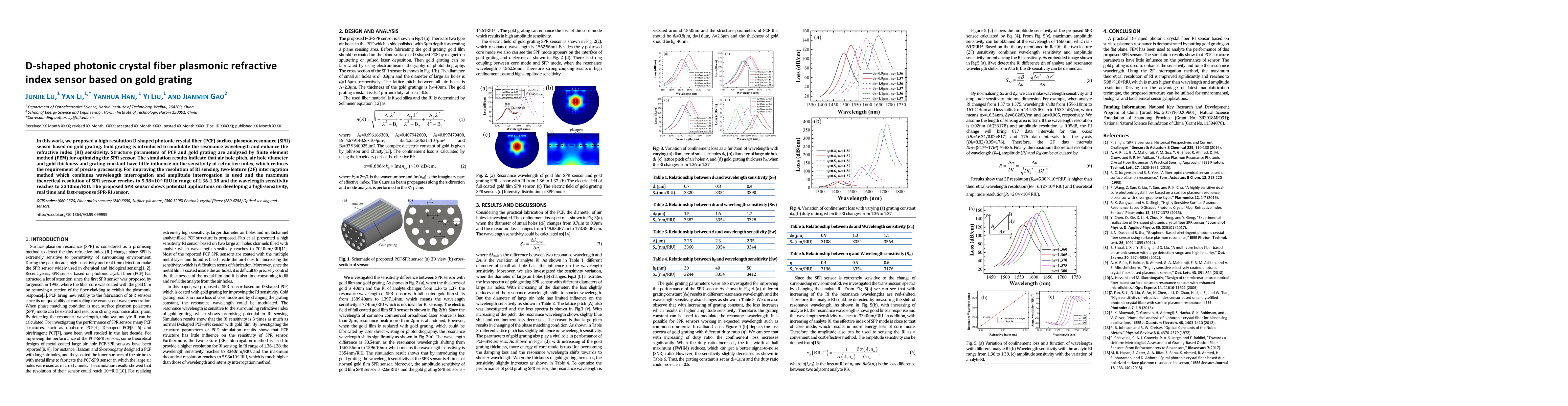 In this work, we proposed a high resolution D-shaped photonic crystal fiber (PCF) surface plasmon resonance (SPR) sensor based on gold grating. Gold grating is introduced to modulate the resonance wavelength and enhance the refractive index (RI) sensitivity. Structure parameters of PCF and gold grating are analyzed by finite element method (FEM) for optimizing the SPR sensor. The simulation results indicate that air hole pitch, air hole diameter and gold thickness and grating constant have little influence on the sensitivity of refractive index, which reduces the requirement of precise processing. For improving the resolution of RI sensing, two-feature (2F) interrogation method which combines wavelength interrogation and amplitude interrogation is used and the maximum theoretical resolution of SPR sensor reaches to 5.98*10-6 RIU in range of 1.36-1.38 and the wavelength sensitivity reaches to 3340nm/RIU. The proposed SPR sensor shows potential applications on developing a high-sensitivity, real time and fast-response SPR-RI sensor.