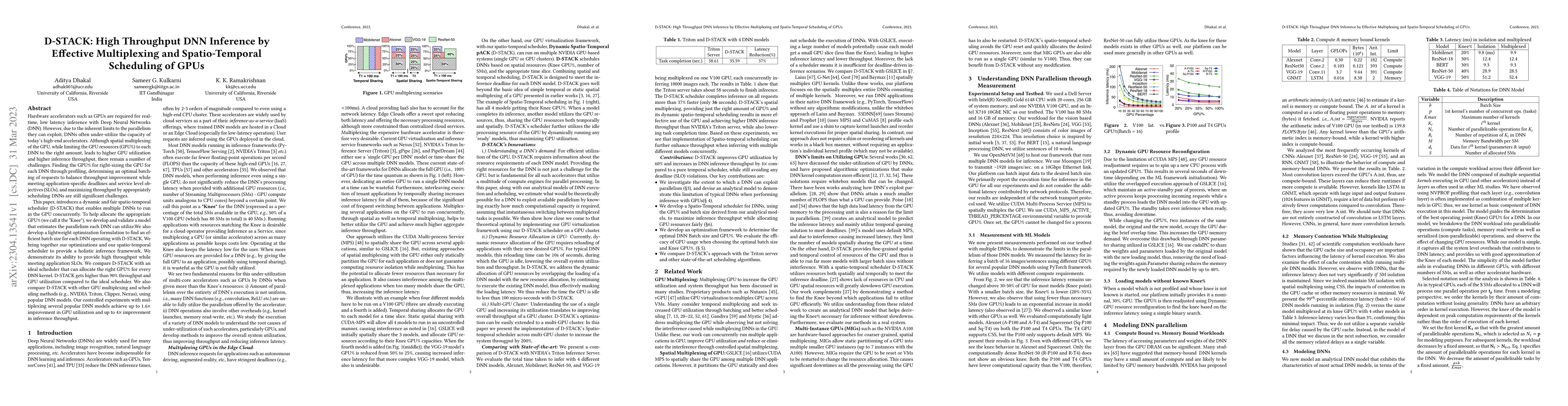 Hardware accelerators such as GPUs are required for real-time, low-latency inference with Deep Neural Networks (DNN). However, due to the inherent limits to the parallelism they can exploit, DNNs often under-utilize the capacity of today's high-end accelerators. Although spatial multiplexing of the GPU, leads to higher GPU utilization and higher inference throughput, there remain a number of challenges. Finding the GPU percentage for right-sizing the GPU for each DNN through profiling, determining an optimal batching of requests to balance throughput improvement while meeting application-specific deadlines and service level objectives (SLOs), and maximizing throughput by appropriately scheduling DNNs are still significant challenges. This paper introduces a dynamic and fair spatio-temporal scheduler (D-STACK) that enables multiple DNNs to run in the GPU concurrently. To help allocate the appropriate GPU percentage (we call it the "Knee"), we develop and validate a model that estimates the parallelism each DNN can utilize. We also develop a lightweight optimization formulation to find an efficient batch size for each DNN operating with D-STACK. We bring together our optimizations and our spatio-temporal scheduler to provide a holistic inference framework. We demonstrate its ability to provide high throughput while meeting application SLOs. We compare D-STACK with an ideal scheduler that can allocate the right GPU percentage for every DNN kernel. D-STACK gets higher than 90 percent throughput and GPU utilization compared to the ideal scheduler. We also compare D-STACK with other GPU multiplexing and scheduling methods (e.g., NVIDIA Triton, Clipper, Nexus), using popular DNN models. Our controlled experiments with multiplexing several popular DNN models achieve up to 1.6X improvement in GPU utilization and up to 4X improvement in inference throughput.