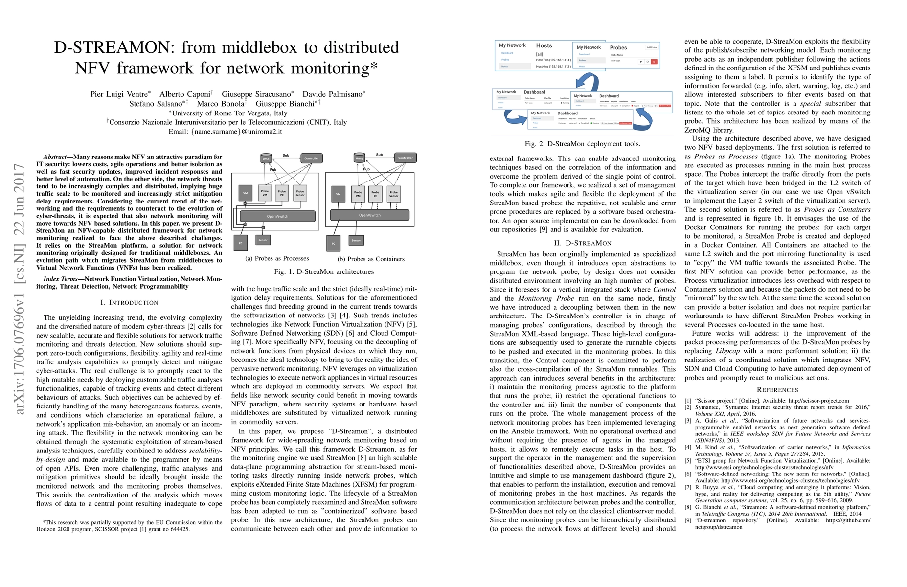 This paper presents D-StreaMon, an NFV-based distributed framework for network monitoring, evolved from the StreaMon platform originally designed for middleboxes. It aims to address the growing complexity and scale of network threats through virtualized network functions.