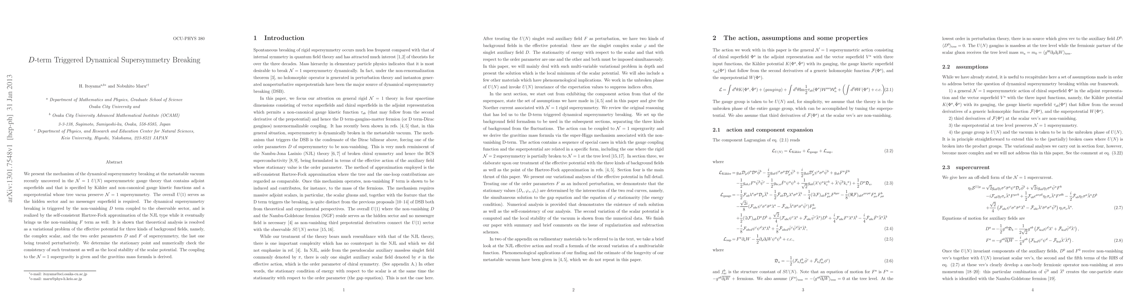 We present the mechanism of the dynamical supersymmetry breaking at the metastable vacuum recently uncovered in the N=1 U(N) supersymmetric gauge theory that contains adjoint superfields and that is specified by Kahler and non-canonical gauge kinetic functions and a superpotential whose tree vacua preserve N=1 supersymmetry. The overall U(1) serves as the hidden sector and no messenger superfield is required. The dynamical supersymmetry breaking is triggered by the non-vanishing D term coupled to the observable sector, and is realized by the self-consistent Hartree-Fock approximation of the NJL type while it eventually brings us the non-vanishing F term as well. It is shown that theoretical analysis is resolved as a variational problem of the effective potential for three kinds of background fields, namely, the complex scalar, and the two order parameters D and F of supersymmetry, the last one being treated perturbatively. We determine the stationary point and numerically check the consistency of such treatment as well as the local stability of the scalar potential. The coupling to the N = 1 supergravity is given and the gravitino mass formula is derived.