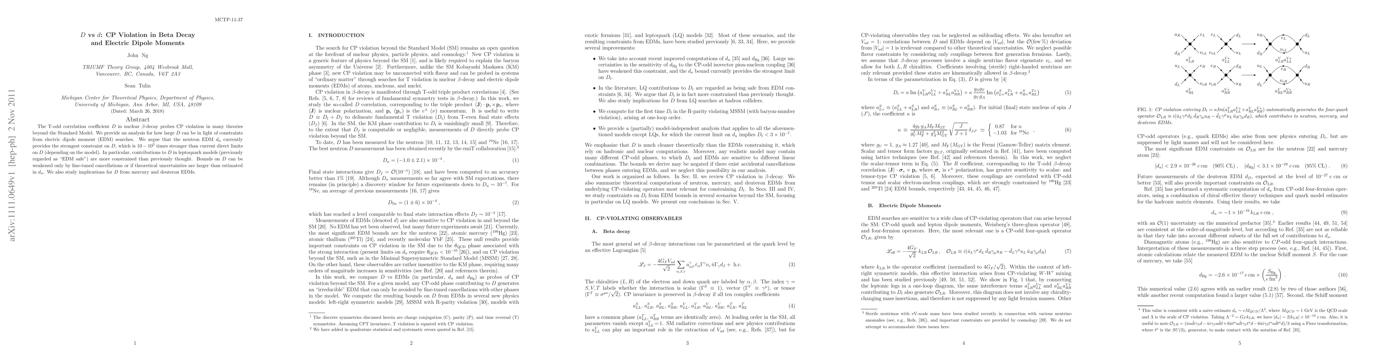 This paper investigates the T-odd correlation coefficient D in nuclear beta decay as a probe for CP violation in theories beyond the Standard Model, finding that the neutron electric dipole moment (EDM) d_n provides the strongest constraint on D. It concludes that contributions to D in leptoquark models are more constrained than previously thought, with bounds potentially only weakened through fine-tuned cancellations or larger theoretical uncertainties.