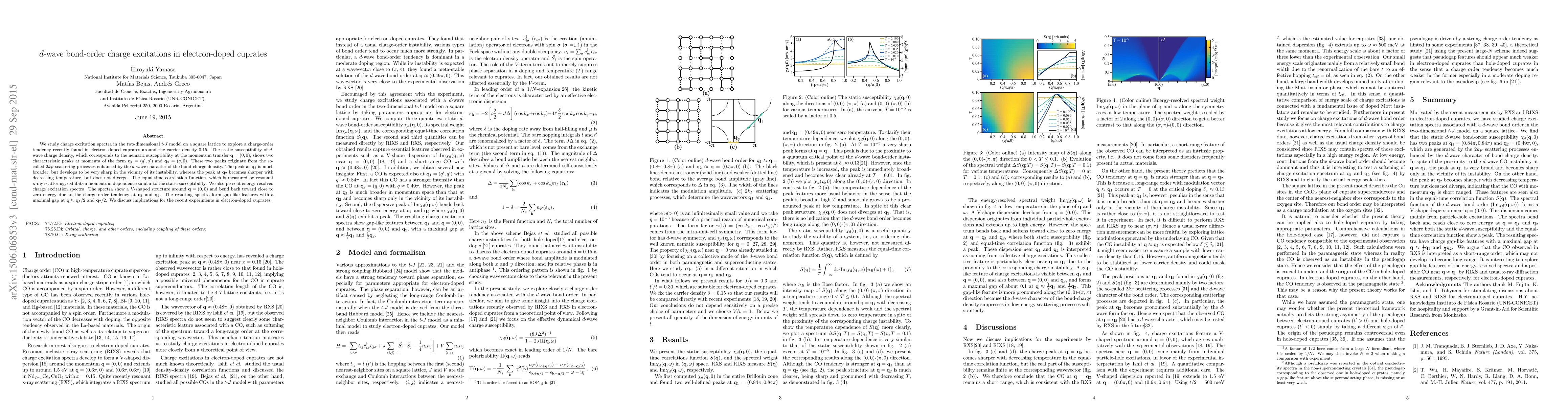 This paper investigates charge excitation spectra in electron-doped cuprates using the $t$-$J$ model, finding $d$-wave bond-order charge excitations with peaks at ${\bf q}_{1}$ and ${\bf q}_{2}$ due to $2k_{F}$ scattering. These peaks reflect a charge-order tendency and form gap-like features, with implications for recent experimental observations in electron-doped cuprates.