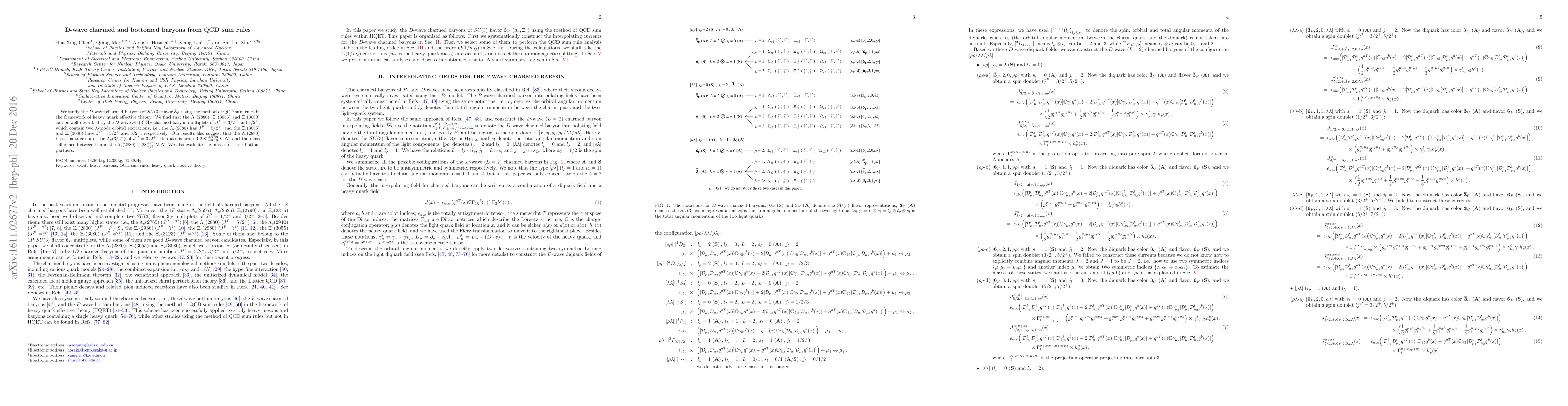 This paper uses QCD sum rules within heavy quark effective theory to study $D$-wave charmed baryons, finding that $\Lambda_c(2880)$, $\Xi_c(3055)$, and $\Xi_c(3080)$ fit $D$-wave $SU(3)$ $\mathbf{\bar 3}_F$ multiplets with $J^P$ values of $5/2^+$, $3/2^+$, and $5/2^+$ respectively. It also predicts a partner state for $\Lambda_c(2880)$ with $J^P=3/2^+$ and evaluates masses for their bottom counterparts.