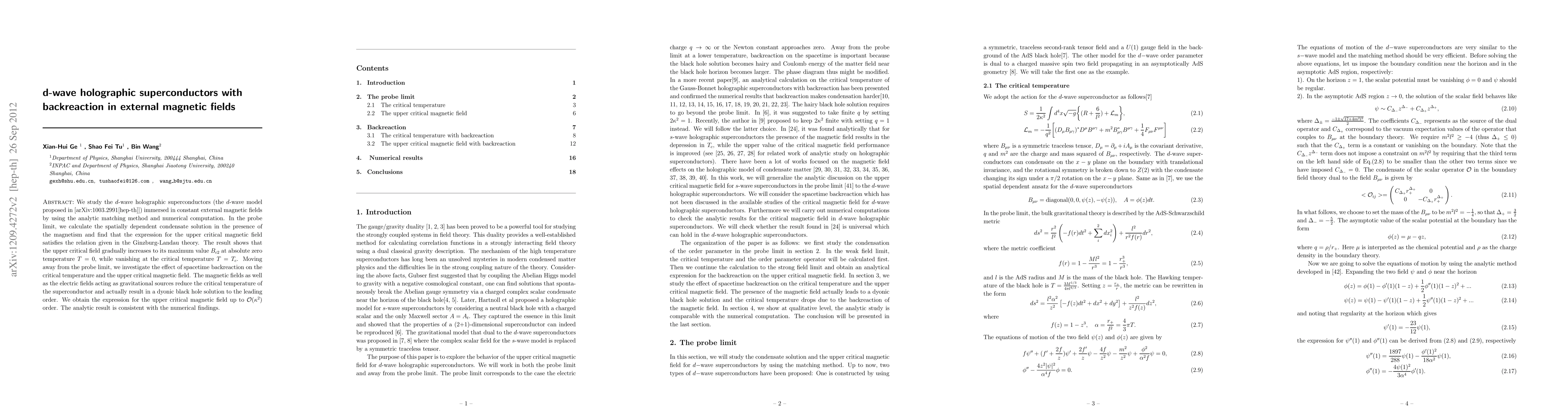 This research investigates d-wave holographic superconductors in constant external magnetic fields, showing the upper critical magnetic field's relation to the Ginzburg-Landau theory. It explores the effects of spacetime backreaction, finding reduced critical temperatures and a dyonic black hole solution, with results consistent across analytical and numerical methods.