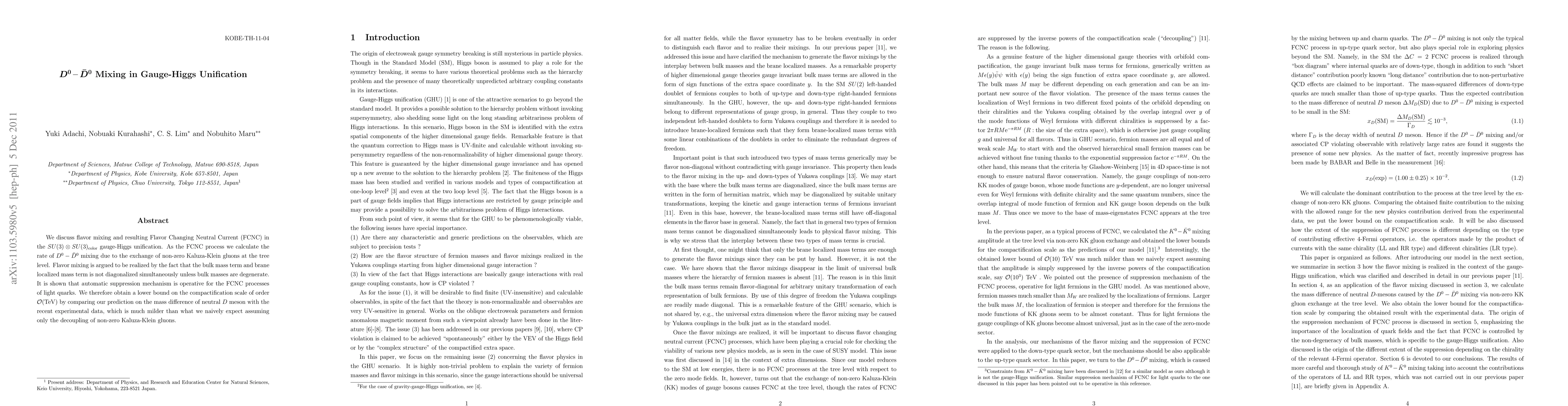 We discuss flavor mixing and resulting Flavor Changing Neutral Current (FCNC) in the SU(3) \otimes SU(3)_color gauge-Higgs unification. As the FCNC process we calculate the rate of D^0-\bar D^0 mixing due to the exchange of non-zero Kaluza-Klein gluons at the tree level. Flavor mixing is argued to be realized by the fact that the bulk mass term and brane localized mass term is not diagonalized simultaneously unless bulk masses are degenerate. It is shown that automatic suppression mechanism is operative for the FCNC processes of light quarks. We therefore obtain a lower bound on the compactification scale of order \cal O(TeV) by comparing our prediction on the mass difference of neutral D meson with the recent experimental data, which is much milder than what we naively expect assuming only the decoupling of non-zero Kaluza-Klein gluons.