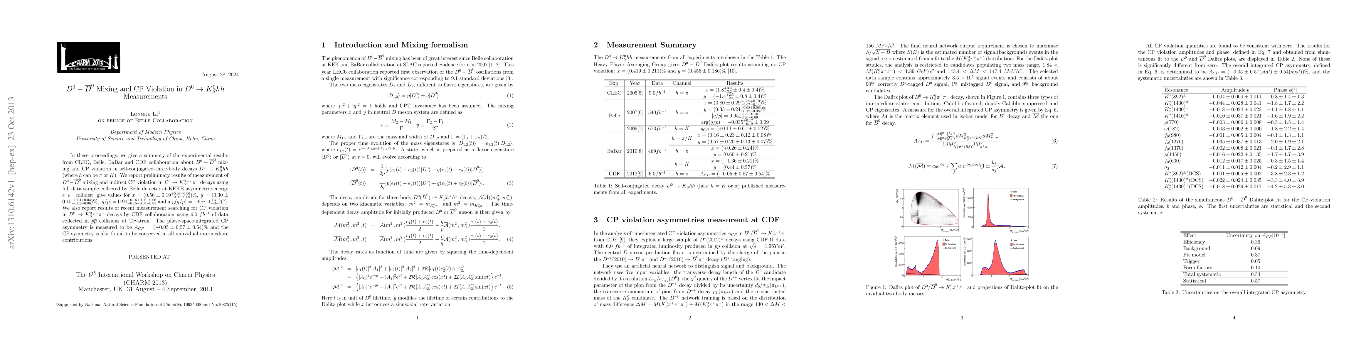 This paper summarizes experimental results on $D^0-\bar{D}^0$ mixing and CP violation from collaborations CLEO, Belle, BaBar, and CDF, focusing on the decay $D^0\rightarrow K_S^0hh$. The Belle collaboration reports preliminary values for mixing parameters and indirect CP violation, while CDF finds no significant CP violation in $D^0\rightarrow K_S^0\pi^+\pi^-$ using Tevatron data.