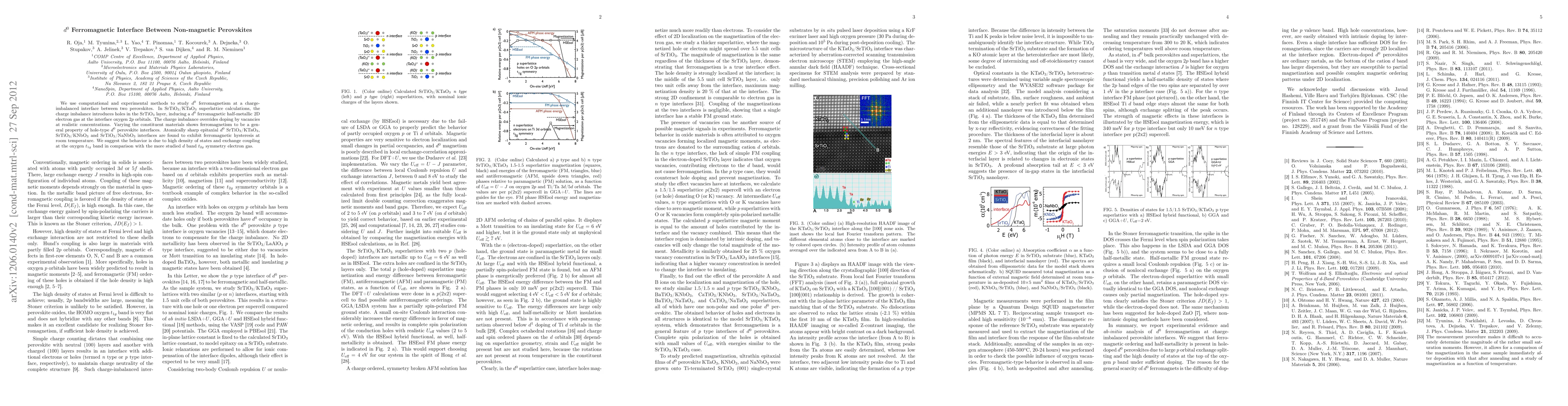 We use computational and experimental methods to study d0 ferromagnetism at a charge- imbalanced interface between two perovskites. In SrTiO3/KTaO3 superlattice calculations, the charge imbalance introduces holes in the SrTiO3 layer, inducing a d0 ferromagnetic half-metallic 2D electron gas at the interface oxygen 2p orbitals. The charge imbalance overrides doping by vacancies at realistic concentrations. Varying the constituent materials shows ferromagnetism to be a gen- eral property of hole-type d0 perovskite interfaces. Atomically sharp epitaxial d0 SrTiO3/KTaO3, SrTiO3 /KNbO3 and SrTiO3 /NaNbO3 interfaces are found to exhibit ferromagnetic hysteresis at room temperature. We suggest the behavior is due to high density of states and exchange coupling at the oxygen t1g band in comparison with the more studied d band t2g symmetry electron gas.