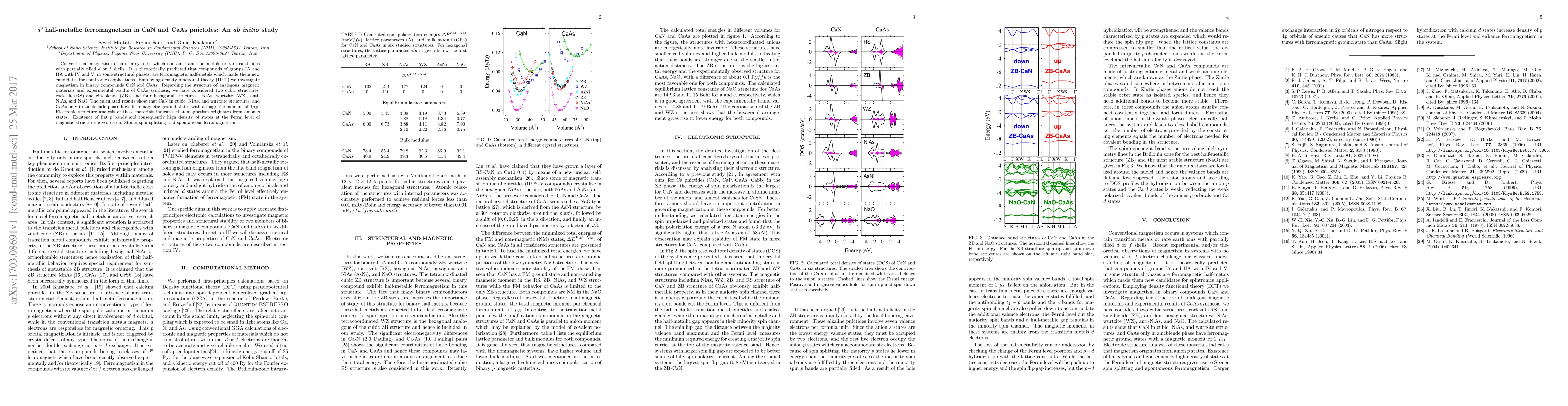 Conventional magnetism occurs in systems which contain transition metals or rare earth ions with partially filled $d$ or $f$ shells. It is theoretically predicted that compounds of groups IA and IIA with IV and V, in some structural phases, are ferromagnetic half-metals which made them new candidates for spintronics applications. Employing density functional theory (DFT) we investigate magnetism in binary compounds CaN and CaAs. Regarding the structure of analogous magnetic materials and experimental results of CaAs synthesis, we have considered two cubic structures: rocksalt (RS) and zincblende (ZB), and four hexagonal structures: NiAs, wurtzite (WZ), anti-NiAs, and NaO. The calculated results show that CaN in cubic, NiAs, and wurtzite structures, and CaAs only in zincblende phase have ferromagnetic ground states with a magnetic moment of $1\mu _B$. Electronic structure analysis of these materials indicates that magnetism originates from anion $p$ states. Existence of flat $p$ bands and consequently high density of states at the Fermi level of magnetic structures gives rise to Stoner spin splitting and spontaneous ferromagnetism.