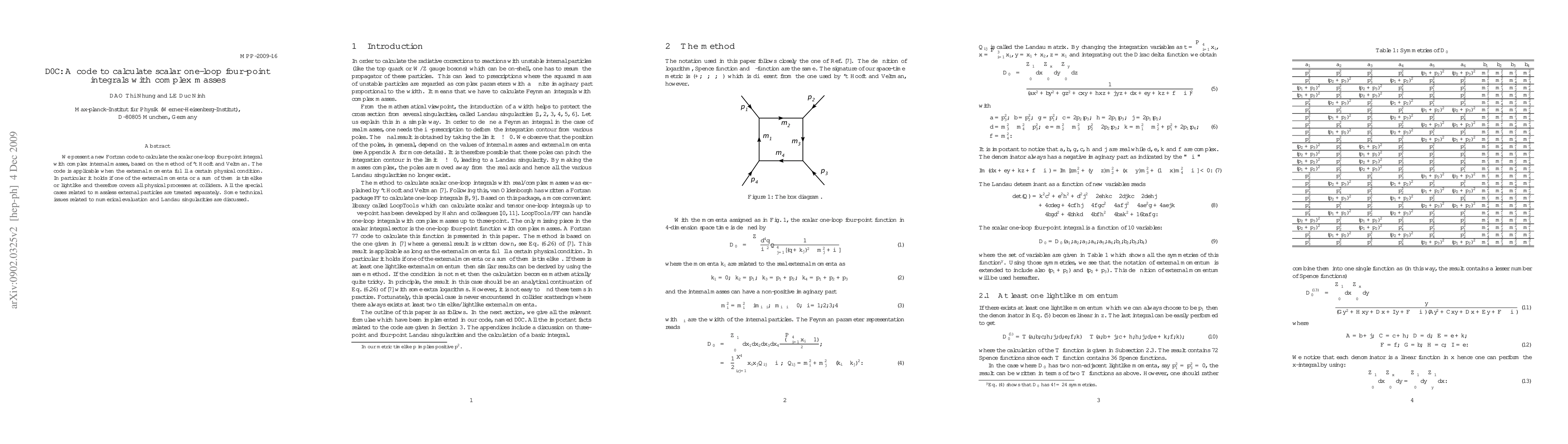 The paper introduces a new Fortran code, D0C, for calculating scalar one-loop four-point integrals with complex masses, employing the 't Hooft and Veltman method. It covers physical conditions where external momenta are timelike or lightlike, addressing special cases for massless particles and discussing numerical evaluation and Landau singularities.