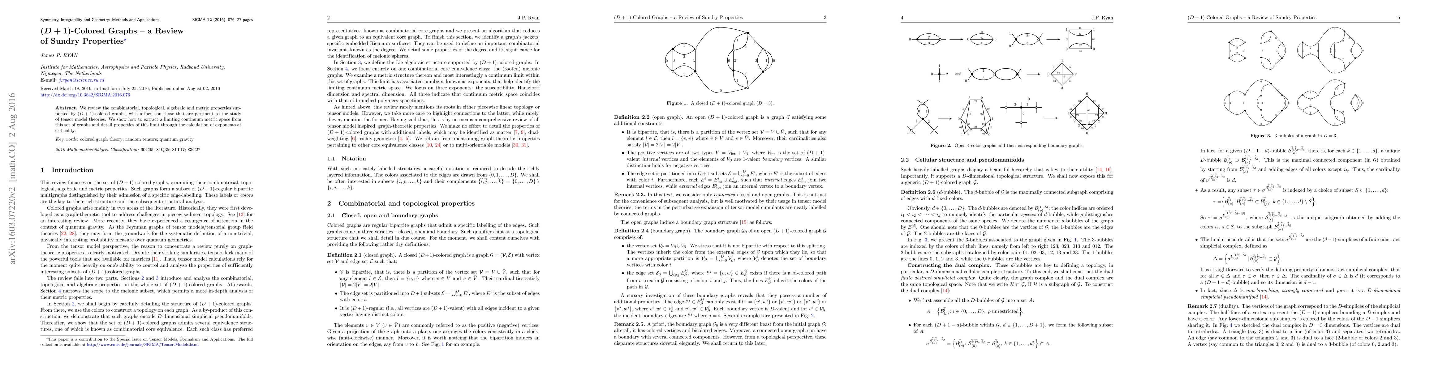 We review the combinatorial, topological, algebraic and metric properties supported by $(D+1)$-colored graphs, with a focus on those that are pertinent to the study of tensor model theories. We show how to extract a limiting continuum metric space from this set of graphs and detail properties of this limit through the calculation of exponents at criticality.