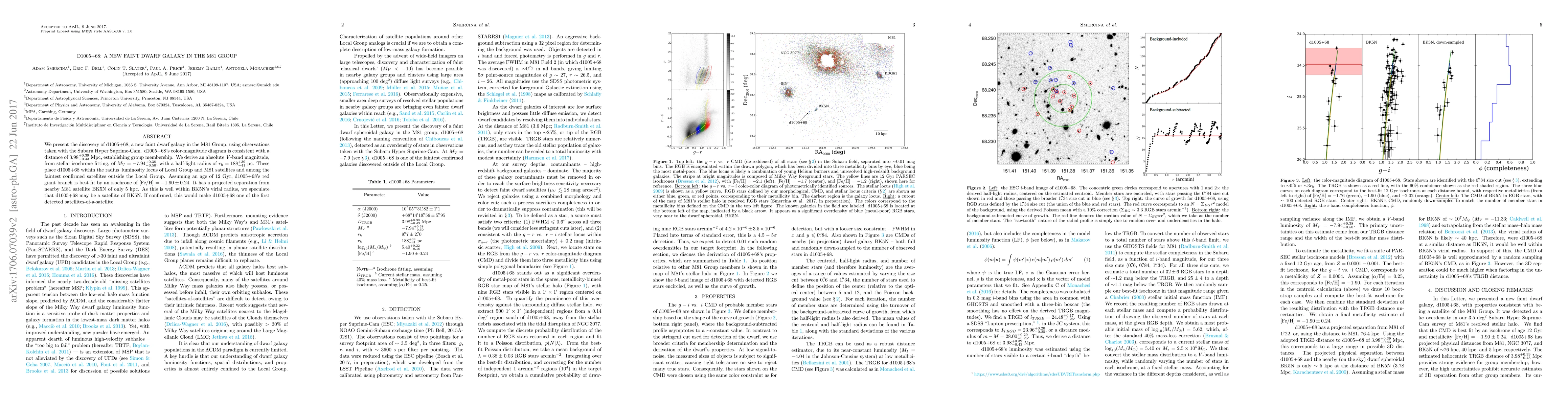 We present the discovery of d1005+68, a new faint dwarf galaxy in the M81 Group, using observations taken with the Subaru Hyper Suprime-Cam. d1005+68's color-magnitude diagram is consistent with a distance of $3.98_{-0.43}^{+0.39}$ Mpc, establishing group membership. We derive an absolute $V$-band magnitude, from stellar isochrone fitting, of $M_{V} = -7.94_{-0.50}^{+0.38}$, with a half-light radius of $r_{h} = 188_{-41}^{+39}$ pc. These place d1005+68 within the radius-luminosity locus of Local Group and M81 satellites and among the faintest confirmed satellites outside the Local Group. Assuming an age of 12 Gyr, d1005+68's red giant branch is best fit by an isochrone of [Fe/H] $= -1.90 \pm 0.24$. It has a projected separation from nearby M81 satellite BK5N of only 5 kpc. As this is well within BK5N's virial radius, we speculate that d1005+68 may be a satellite of BK5N. If confirmed, this would make d1005+68 one of the first detected satellites-of-a-satellite.
