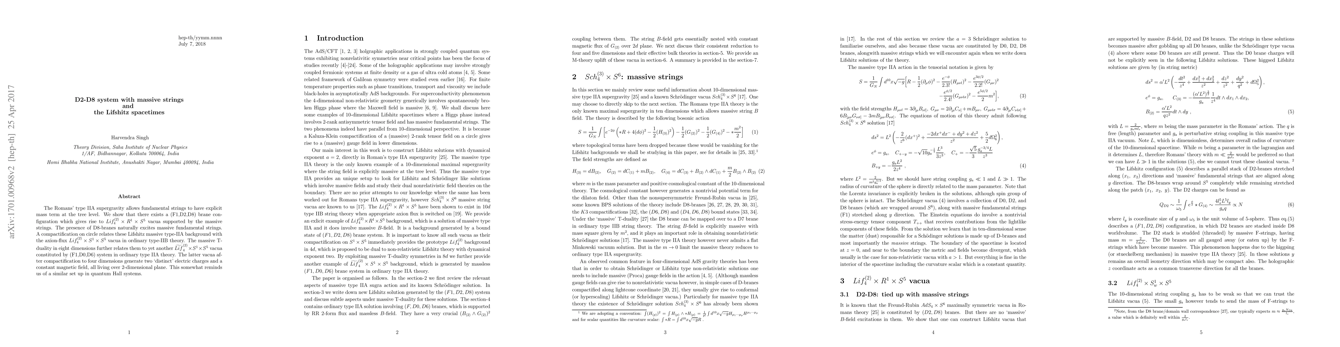 The Romans type IIA supergravity allows fundamental strings to have explicit mass term at the tree level. We show that there exists a (F1,D2,D8) brane configuration which gives rise to $Lif_4^{(2)}\times {R}^1\times S^5$ vacua supported by the massive strings. The presence of D8-branes naturally excites massive fundamental strings. A compactification on circle relates these Lifshitz massive type-IIA background with the axion-flux $Lif_4^{(2)}\times {S}^1\times S^5$ vacua in ordinary type-IIB theory. The massive T-duality in eight dimensions further relates them to yet another $\widetilde{Lif}_4^{(2)}\times S^1\times S^5$ vacua constituted by (F1,D0,D6) system in ordinary type IIA theory. The latter vacua after compactification to four dimensions generate two `distinct' electric charges and a constant magnetic field, all living over 2-dimensional plane. This somewhat reminds us of a similar set up in quantum Hall systems.