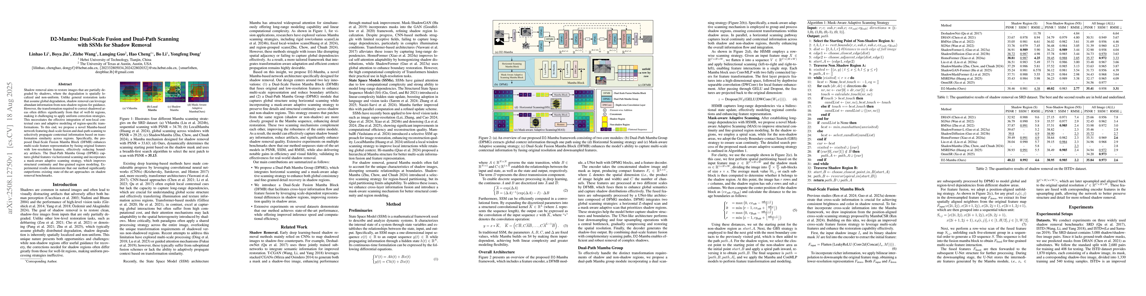 Shadow removal aims to restore images that are partially degraded by shadows, where the degradation is spatially localized and non-uniform. Unlike general restoration tasks that assume global degradation, shadow removal can leverage abundant information from non-shadow regions for guidance. However, the transformation required to correct shadowed areas often differs significantly from that of well-lit regions, making it challenging to apply uniform correction strategies. This necessitates the effective integration of non-local contextual cues and adaptive modeling of region-specific transformations. To this end, we propose a novel Mamba-based network featuring dual-scale fusion and dual-path scanning to selectively propagate contextual information based on transformation similarity across regions. Specifically, the proposed Dual-Scale Fusion Mamba Block (DFMB) enhances multi-scale feature representation by fusing original features with low-resolution features, effectively reducing boundary artifacts. The Dual-Path Mamba Group (DPMG) captures global features via horizontal scanning and incorporates a mask-aware adaptive scanning strategy, which improves structural continuity and fine-grained region modeling. Experimental results demonstrate that our method significantly outperforms existing state-of-the-art approaches on shadow removal benchmarks.