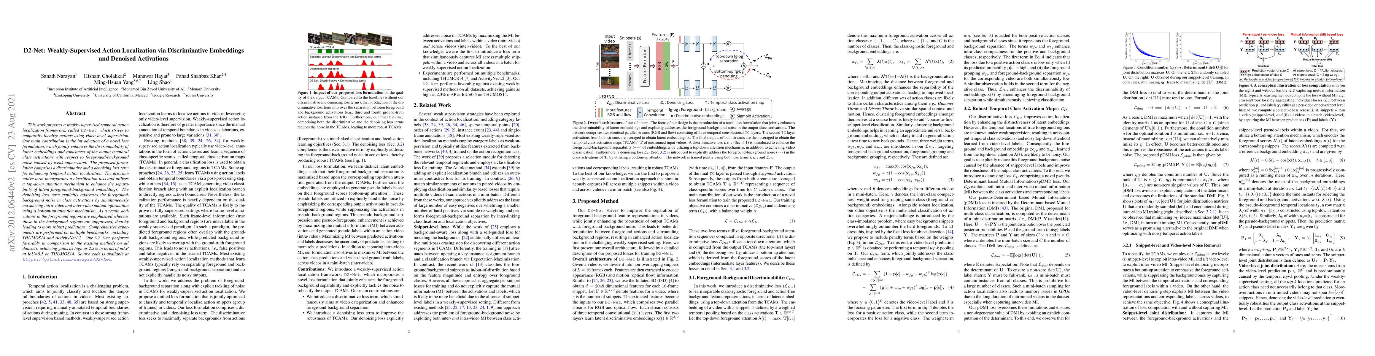 D2-Net introduces a weakly-supervised framework for temporal action localization using video-level supervision, employing discriminative embeddings and denoised activations to enhance localization accuracy. The method combines discriminative and denoising losses to improve the separability of foreground-background embeddings and suppress background noise, achieving superior performance on benchmarks like THUMOS14 and ActivityNet1.2.