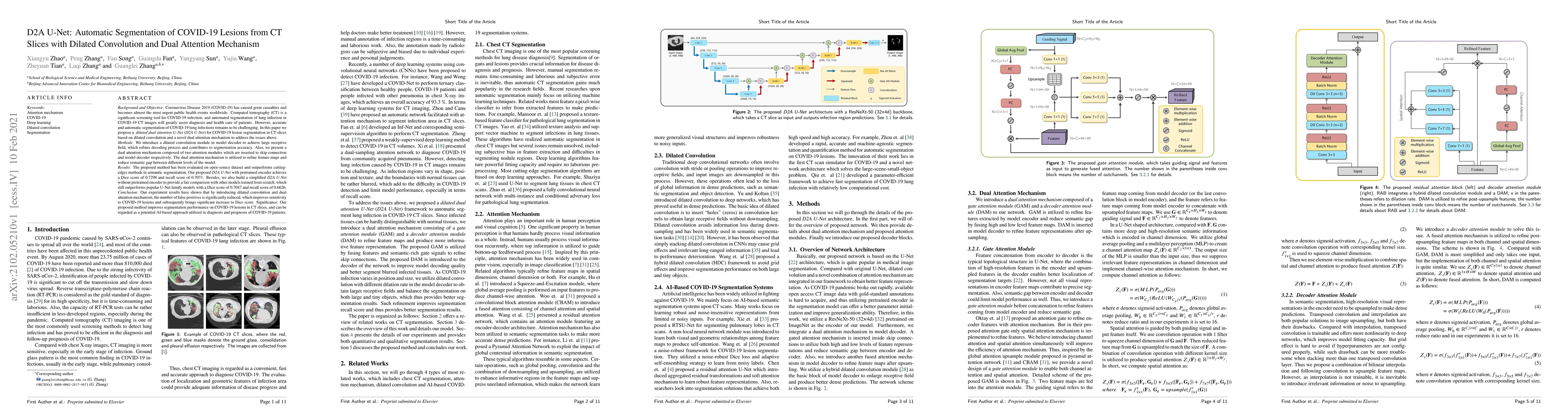 The paper proposes a D2A U-Net for automatic segmentation of COVID-19 lesions in CT scans, integrating dilated convolutions and a dual attention mechanism to enhance segmentation accuracy. The model achieves superior Dice and recall scores compared to other methods, demonstrating reduced false positives and improved sensitivity to COVID-19 lesions.