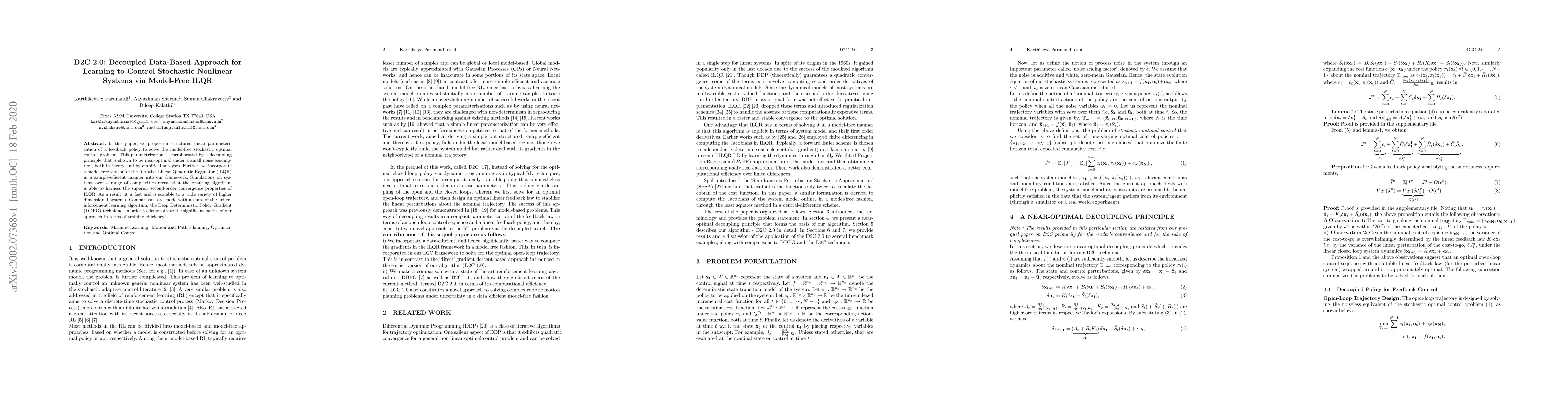 In this paper, we propose a structured linear parameterization of a feedback policy to solve the model-free stochastic optimal control problem. This parametrization is corroborated by a decoupling principle that is shown to be near-optimal under a small noise assumption, both in theory and by empirical analyses. Further, we incorporate a model-free version of the Iterative Linear Quadratic Regulator (ILQR) in a sample-efficient manner into our framework. Simulations on systems over a range of complexities reveal that the resulting algorithm is able to harness the superior second-order convergence properties of ILQR. As a result, it is fast and is scalable to a wide variety of higher dimensional systems. Comparisons are made with a state-of-the-art reinforcement learning algorithm, the Deep Deterministic Policy Gradient (DDPG) technique, in order to demonstrate the significant merits of our approach in terms of training-efficiency.