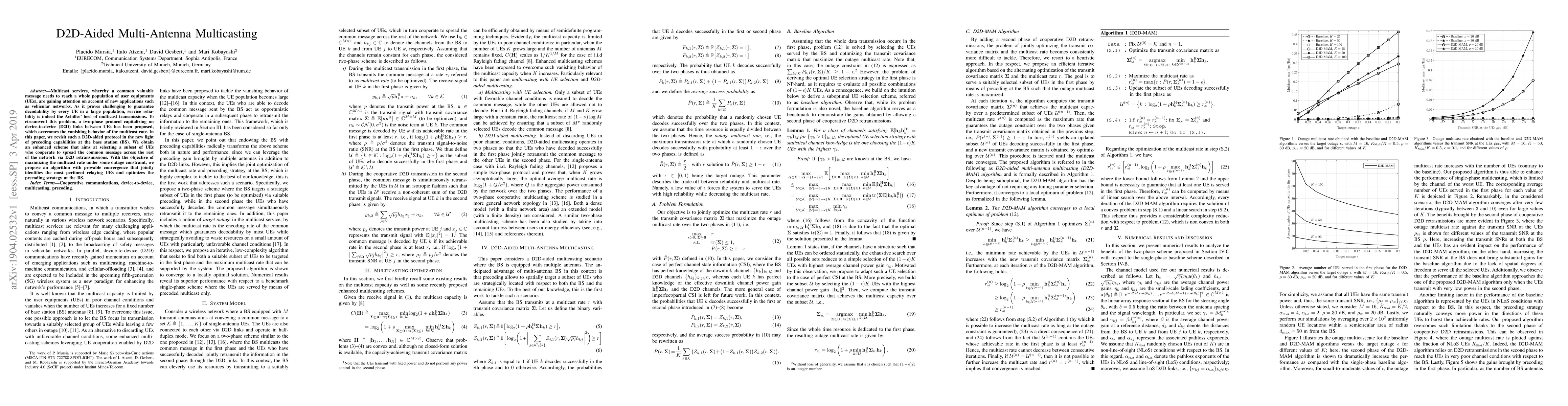 Multicast services, whereby a common valuable message needs to reach a whole population of user equipments (UEs), are gaining attention on account of new applications such as vehicular networks. As it proves challenging to guarantee decodability by every UE in a large population, service reliability is indeed the Achilles' heel of multicast transmissions. To circumvent this problem, a two-phase protocol capitalizing on device-to-device (D2D) links between UEs has been proposed, which overcomes the vanishing behavior of the multicast rate. In this paper, we revisit such D2D-aided protocol in the new light of precoding capabilities at the base station (BS). We obtain an enhanced scheme that aims at selecting a subset of UEs who cooperate to spread the common message across the rest of the network via D2D retransmissions. With the objective of maximizing the multicast rate under some outage constraint, we propose an algorithm with provable convergence that jointly identifies the most pertinent relaying UEs and optimizes the precoding strategy at the BS.